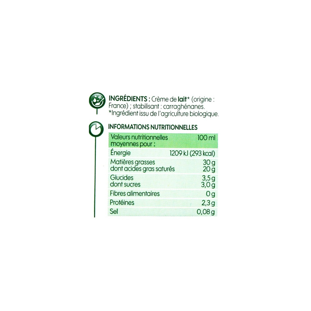 Creme entier fluide sterilisee UHT a 30% de matiere grasse issue de l'agriculture biologique