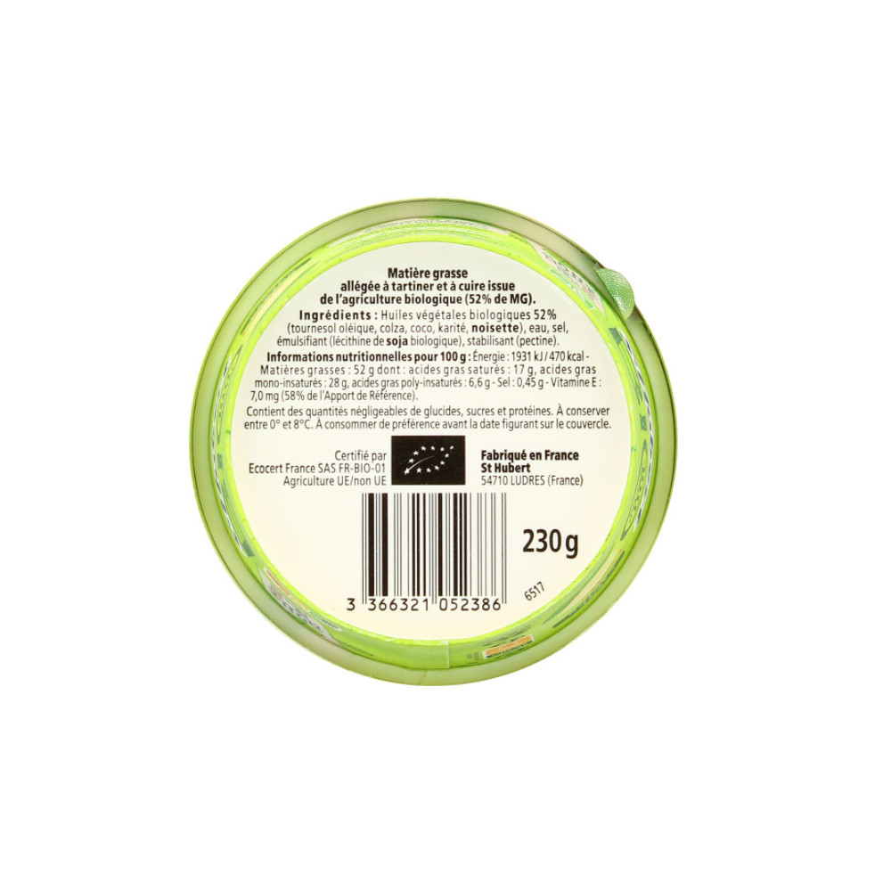 Matière grasse allégée à tartiner et à cuire issue de l'agriculture biologique (52% de MG). Sans lactose, BIO, Végétarien.