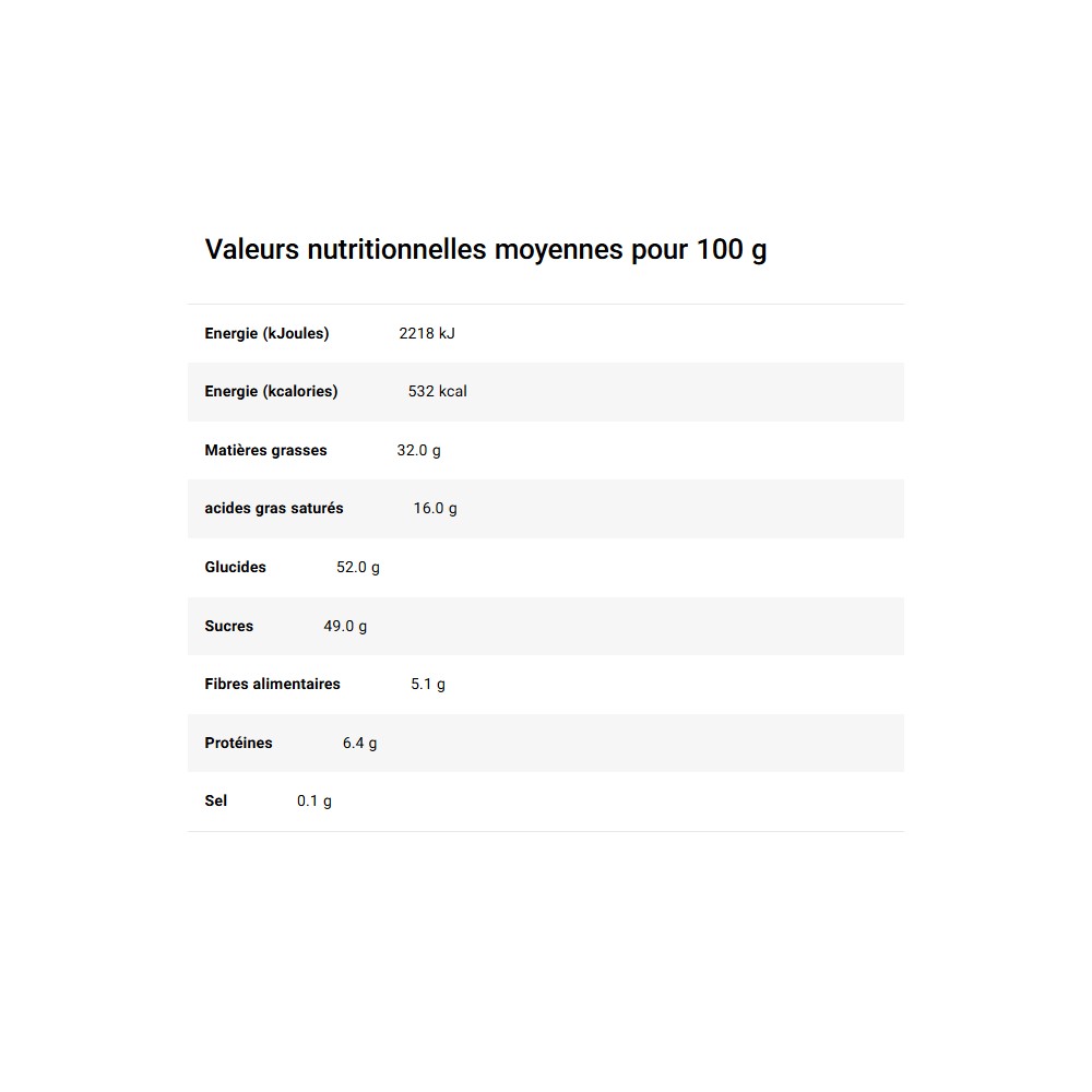| Nutri-Score | E Le Nutri-Score figurant sur l'emballage du produit correspond à l'ancien calcul (en vigueur avant avril 2025) |