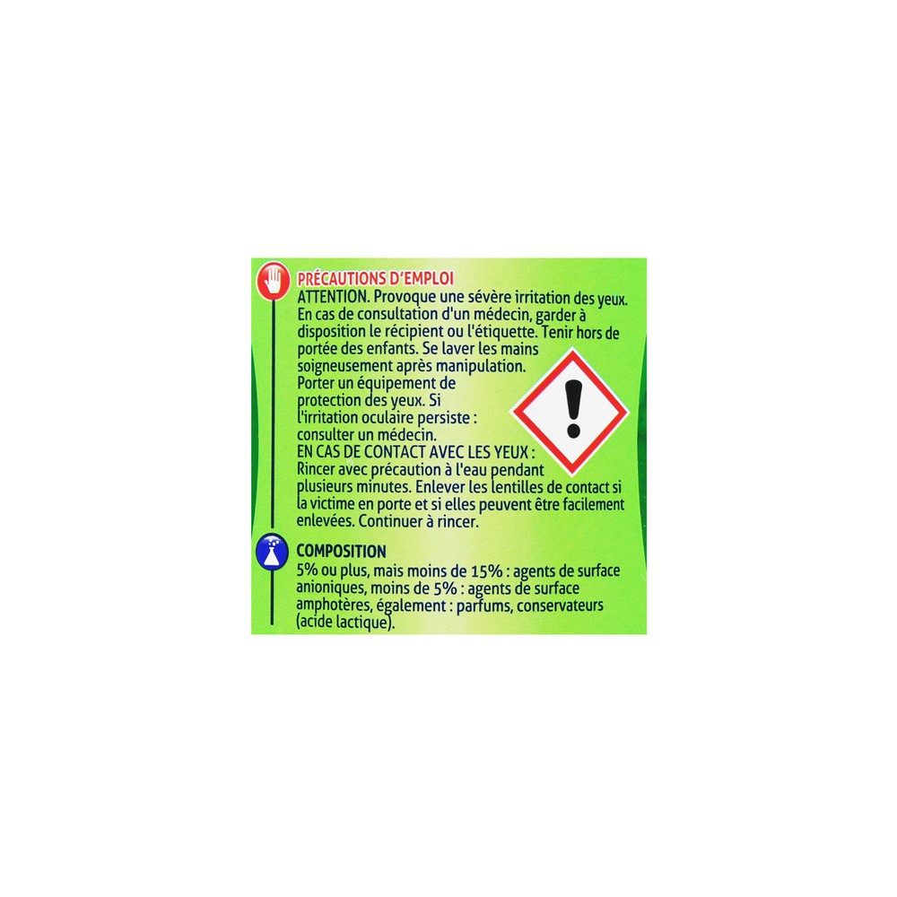 5% ou plus mais moins de 15% : agents de surface anioniques, moins de 5% : agents de surface amphotéres, également : parfums, conservateurs (acide lactique).