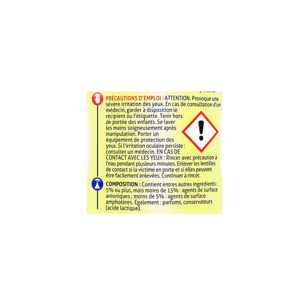 Contient entre autres ingrédients : 5% ou plus mais moins de 15% : agents de surface anioniques; moins de 5% : agents de surface amphotéres. Egalment : parfums, conservateurs (acide lactique)