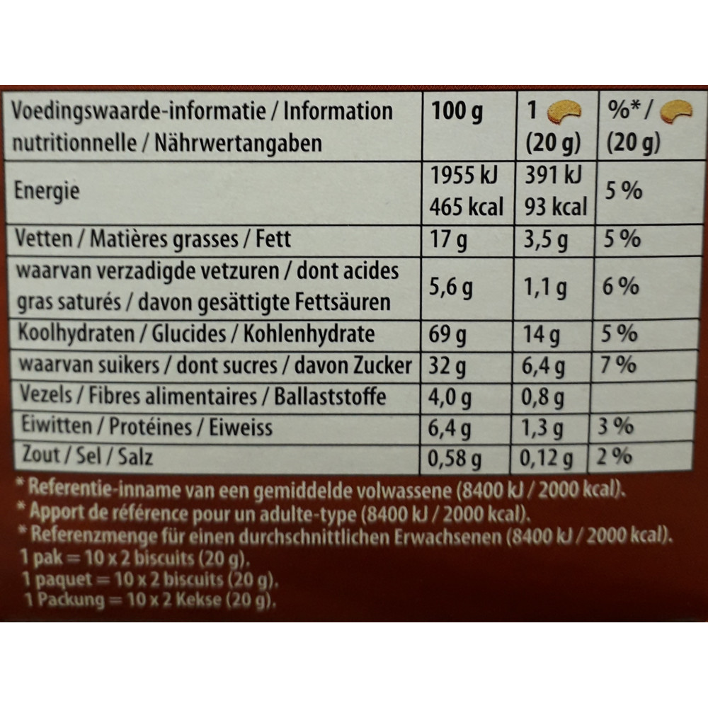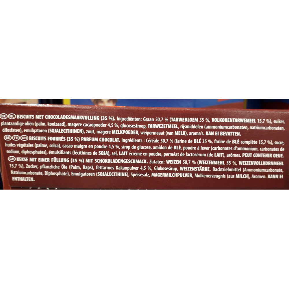 Céréale 50,7 % (farine de BLÉ 35 %, farine de BLÉ complète 15,7 %), sucre, huiles végétales (palme, colza), cacao maigre en poudre 4,5 %, sirop de glucose, amidon de BLÉ, poudre à lever (carbonate acide d'ammonium, carbonate acide de sodium, diphosphate disodique), émulsifiants (lécithine de SOJA, lécithine de tournesol), sel, LAIT écrémé en poudre, lactose et protéines de LAIT, arômes. PEUT CONTENIR ŒUF.
