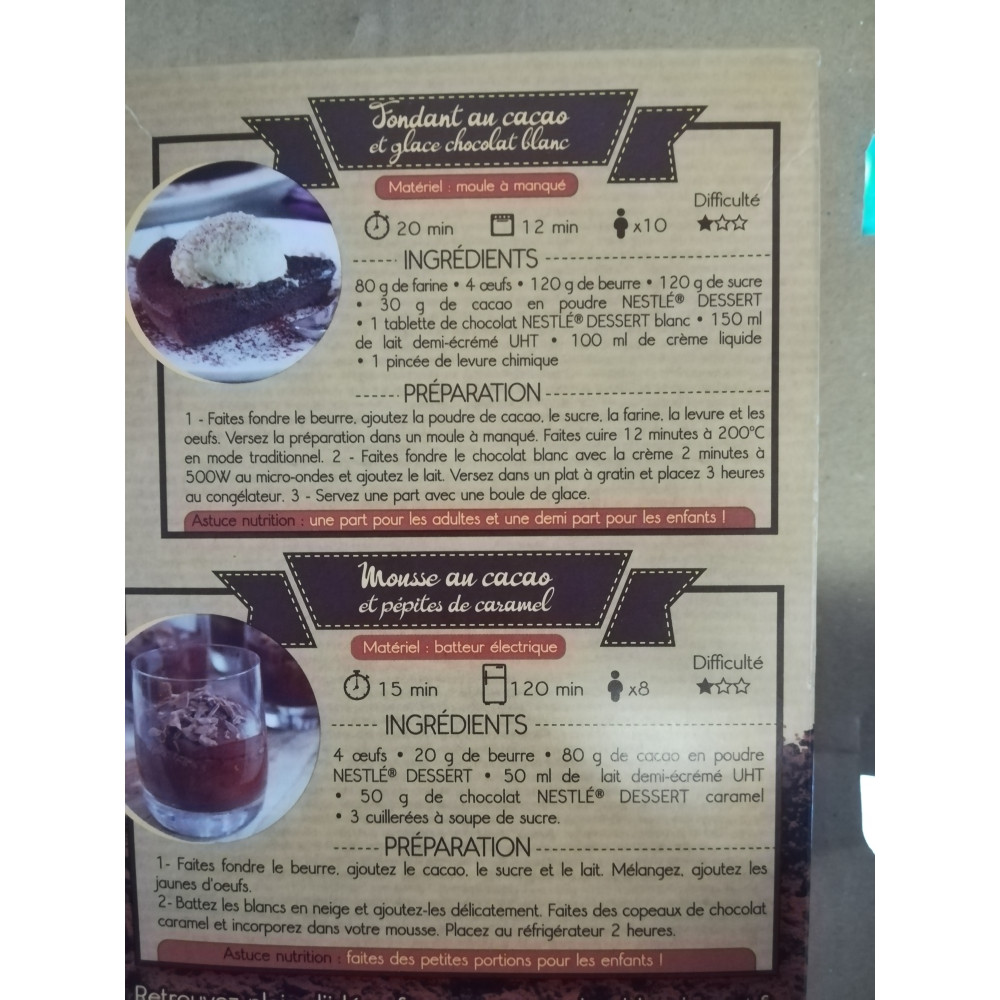 NESTLE DESSERT est une poudre brute non sucrée, idéale pour vos boissons et pâtisseries chocolatées. Tout le savoir-faire chocolatier de Nestlé Dessert en poudre. Colorez vos pâtes à crêpes, donnez un goût cacao à vos crèmes pâtissières, préparez des sauces gourmandes au cacao ou encore jouez l'association du cacao et des fruits.