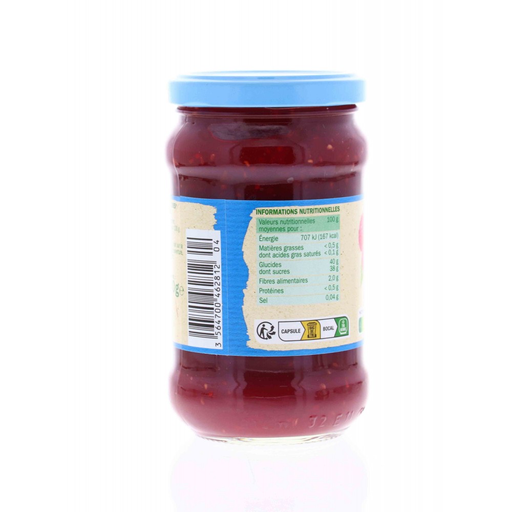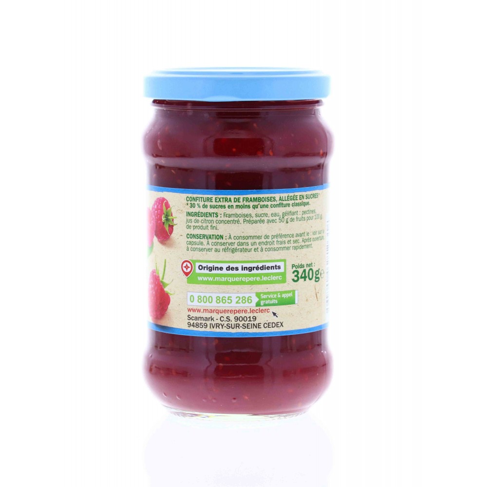 Confiture extra de framboises, allégée en sucres*. *30% de sucres en moins qu'une confiture classique.