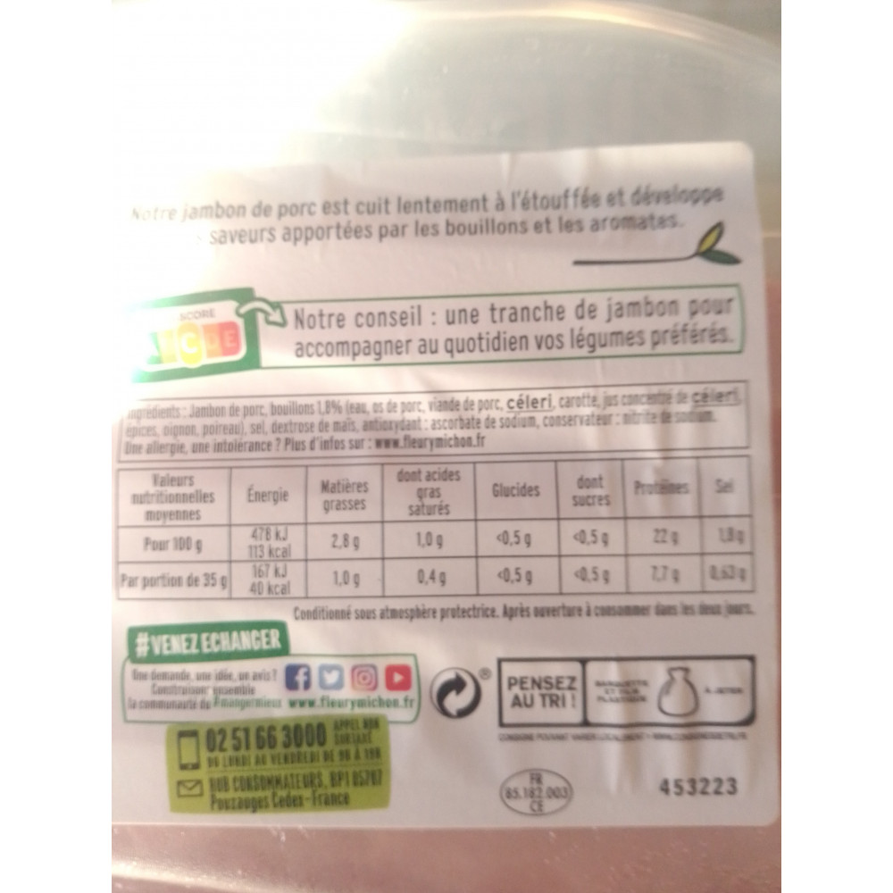 Ingrédients: Jambon de porc, bouillons 1.8% (eau, os de porc, viande de porc, CELERI, carotte, jus concentré de CELERI, épices, oignon, poireau), sel, dextrose de maïs, antioxydant : ascorbate de sodium, conservateur : nitrite de sodium.