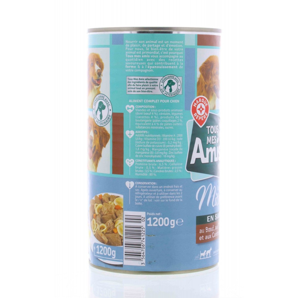 Composition : Viandes et sous-produits animaux (dont bœuf 4 %), céréales, légumes (carottes 4 %), produits de la boulangerie (pâtes coquillages 2 %, équivalent à 4 % de pâtes cuites), substances minérales, sucres.