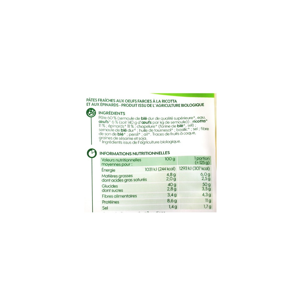 Pâte 60% : semoule de blé dur de qualité supérieure*, eau, œufs* 6 % (soit 140 g par kg de semoule). Farce 40% : ricotta* 11 %, épinards* 11 %, chapelure* (farine de blé*, sel), semoule de blé dur*, huile de tournesol*, basilic*, sel, fibre de son de blé*, persil*, ail*. Les pourcentages sont exprimés sur le produit total. Traces de fruits à coque, sésame et soja. * Ingrédients issus de l'agriculture biologique.