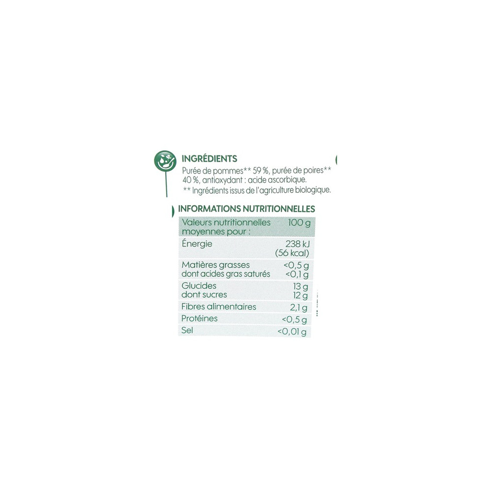 Purée de pommes* 49 %, purée de poires* 49 %, antioxydant : acide ascorbique. *Ingrédients issus de l'agriculture biologique.