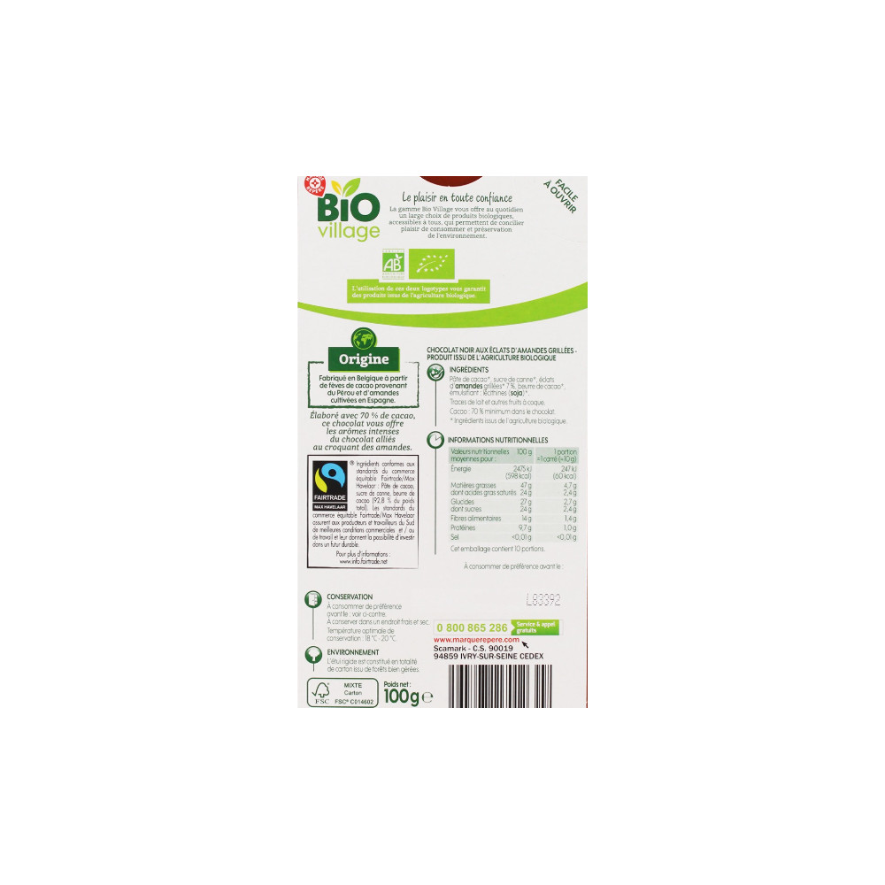 Tablette Chocolat noir éclats d'amandes Pérou BIO VILLAGE 100g