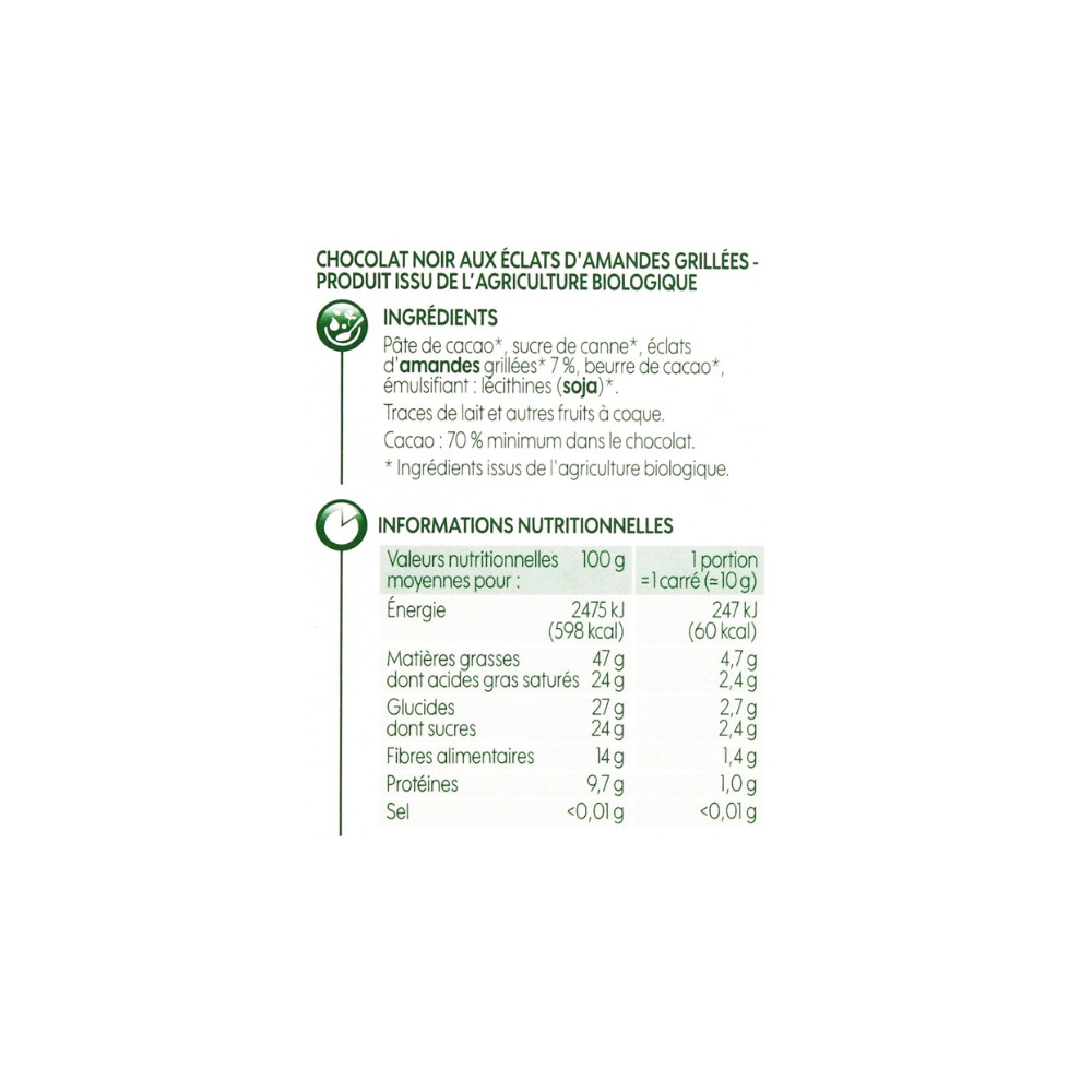 Pâte de cacao*, sucre de canne*, éclats d'amandes grillées* 7 %, beurre de cacao*, émulsifiant : lécithines (soja)*. Traces de lait et autres fruits à coque. Cacao : 70 % minimum dans le chocolat. *Ingrédients issus de l'agriculture biologique.