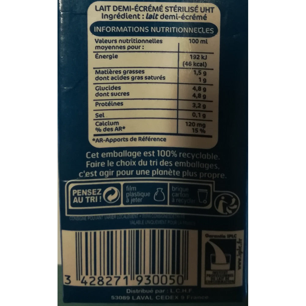 Lait demi-écrémé LAIT DE FRANCE 1L