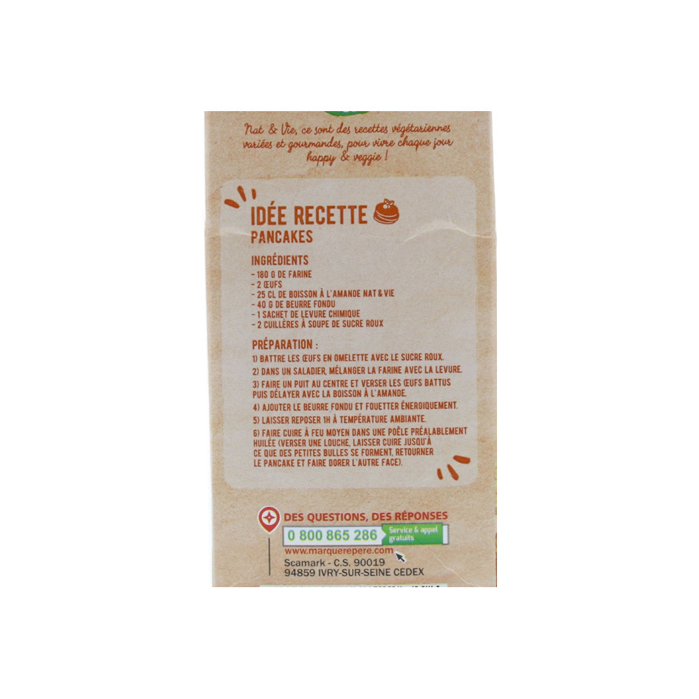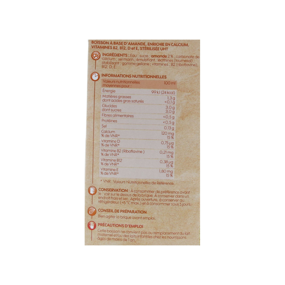 Eau ; sucre ; amande 2 % ; carbonate de calcium ; sel marin ; émulsifiant : lécithines (tournesol) ; stabilisant : gomme gellane ; vitamines : B2(riboflavine), B12, D, E.