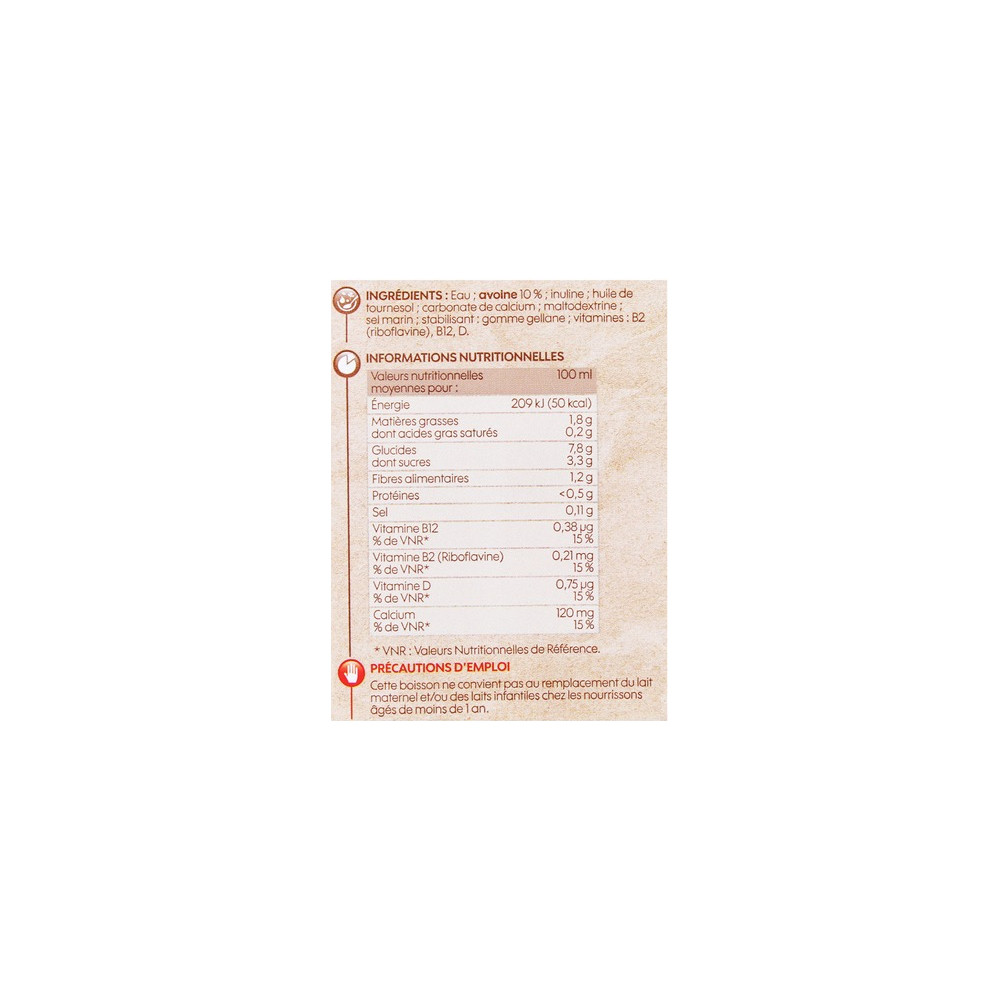 Eau ; avoine 10 % ; inuline ; huile de tournesol ; carbonate de calcium ; maltodextrine ; sel marin ; stabilisant : gomme gellane ; vitamines : B2 (riboflavine), B12, D.