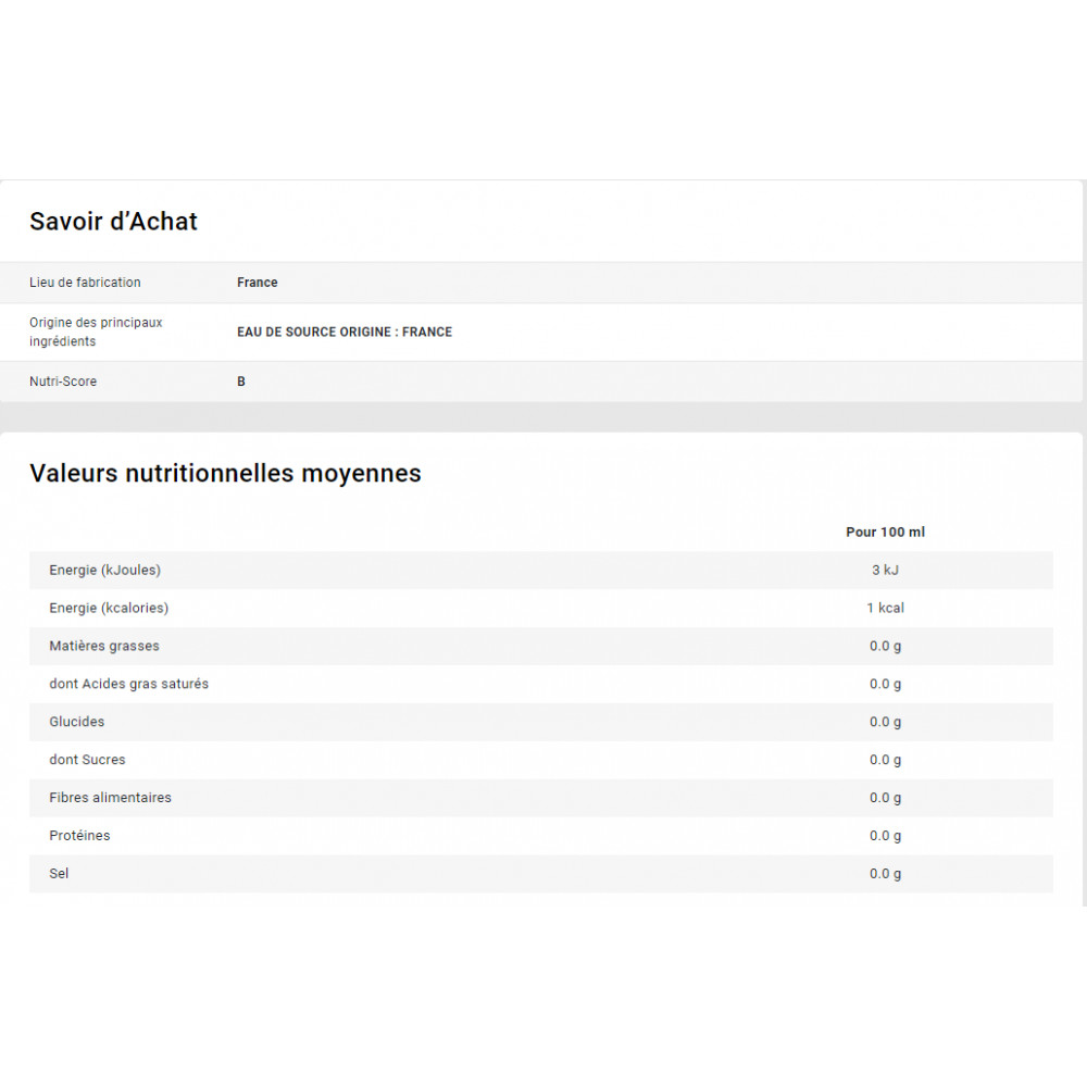 Eau de source 99 % ; acidifiant : acide citrique ; arôme naturel de fraise ; édulcorants : sucralose, acésulfame-k.