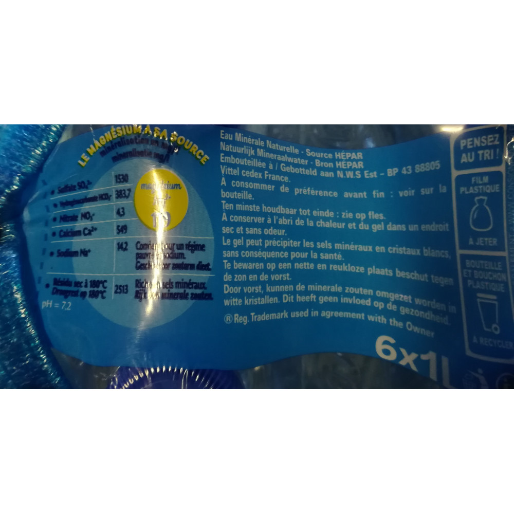 Une eau minérale naturelle unique : HEPAR facilite le transit intestinal*. De plus, la consommation d'1 litre permet de couvrir 31% des apports recommandés en magnésium. * HEPAR peut être laxative. Boire 1 litre d'HEPAR par jour dans le cadre d'une alimentation variée et équilibrée et d'un mode de vie sain.