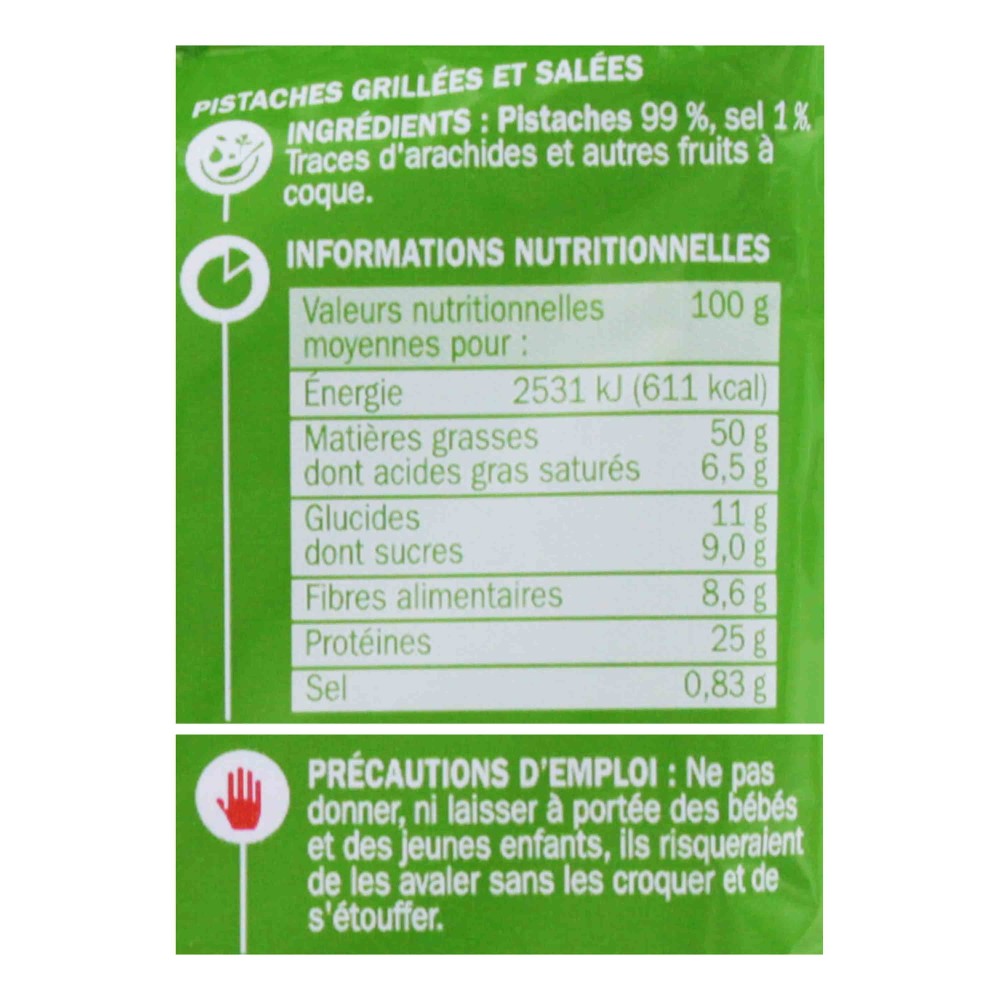 Pistaches 99 %, sel 1%. Traces d'arachides et autres fruits à coque.