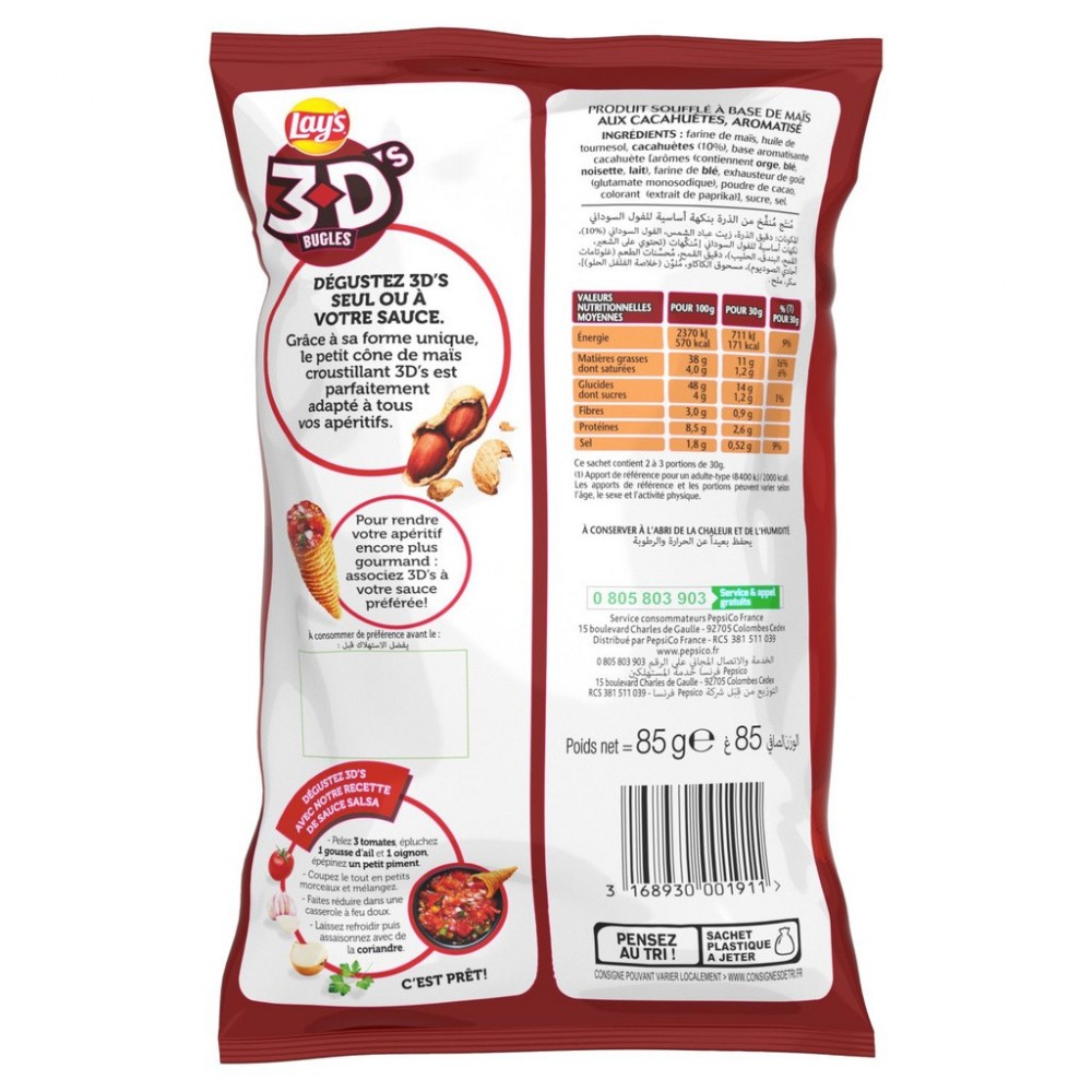 Une délicieuse recette au bon goût de cacahuète ! Ces petits cônes de maïs uniques, croustillants et tellement bons donneront du relief à vos apéritifs grâce à leur forme en 3 dimensions ! Découvrez toutes les variétés Lay's 3D's Bugles goût fromage Lay's 3D's Bugles goût nature Lay's 3D's Bugles goût bacon Lay's 3D's Bugles goût cacahuète