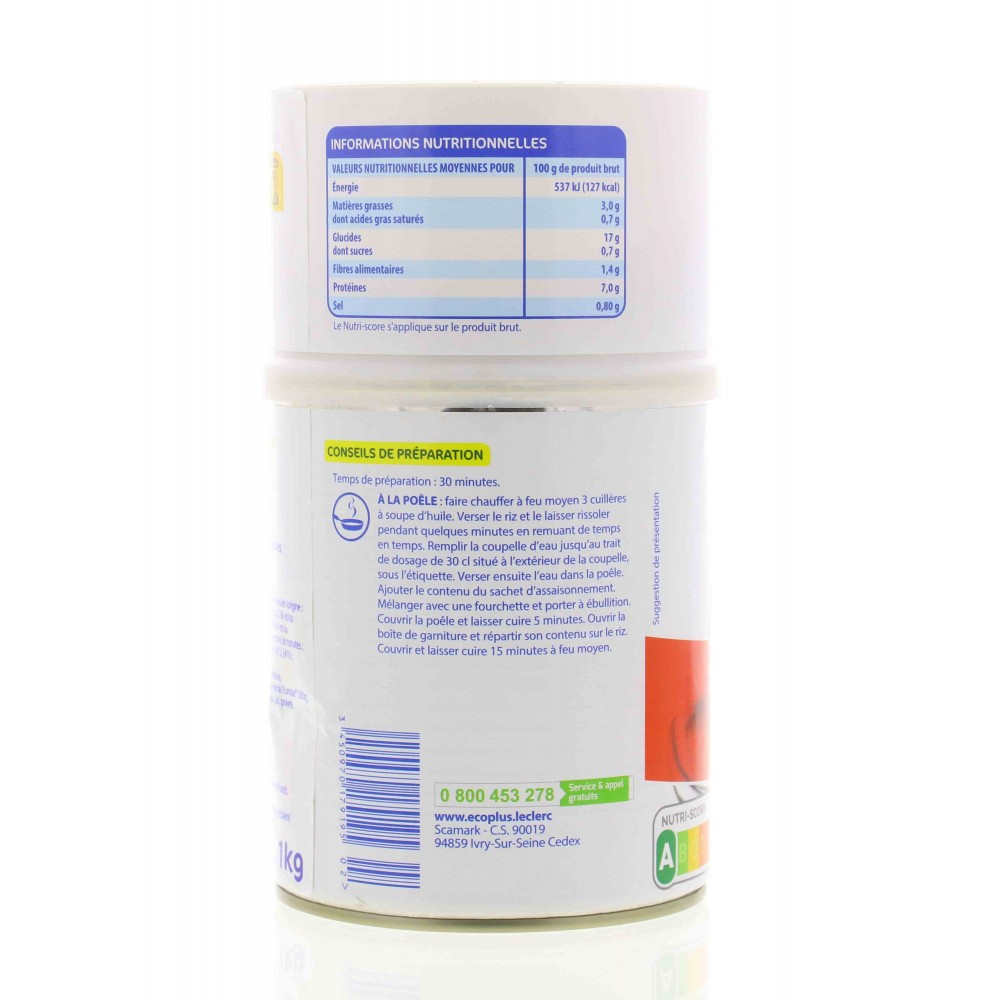 Ingrédients:1 boîte de garniture 800g : eau ; morceaux de cuisses de poulet (origine : Europe) 24% ; carottes ; moules décoquillées (élevées au Chili et/ou Danemark et/ou pêchées en Océan Atlantique Nord-Est et/ou Pacifique Sud-Est*) 7,8% ; petits pois 4,9% ; triple concentré de tomates ; poivrons ; oignons ; sel ; huile de colza ; épaississants : E412, E410 ; arôme naturel d'épices et aromates.Les pourcentages sont exprimés sur la boîte de garniture.1 coupelle de riz long étuvé (origine : Amérique, Asie et/ou Europe*) 200g.1 sachet d’assaisonnement : curcuma, piment doux, ail, poivre.