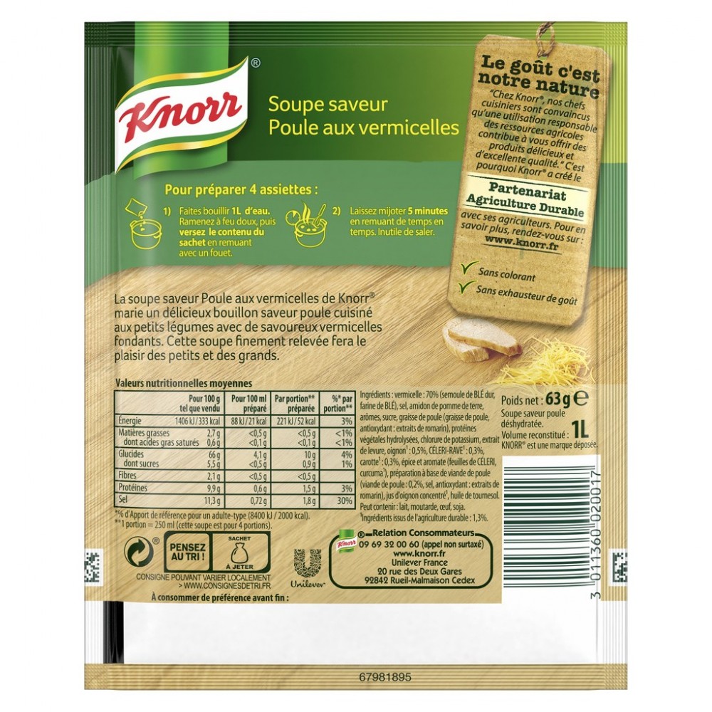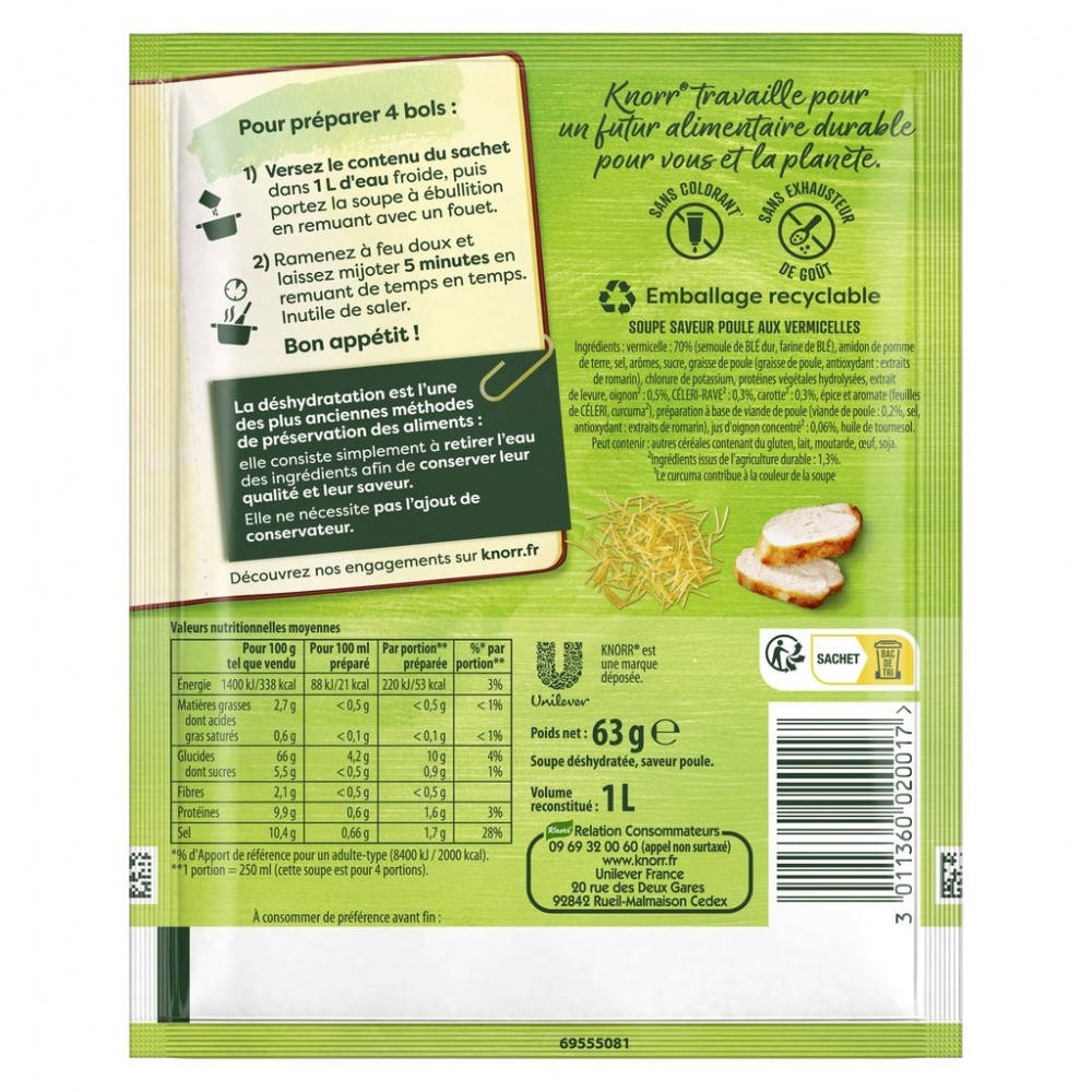 Grâce à la délicieuse Soupe Déshydratée saveur Poule aux Vermicelles de Knorr ®, retrouvez tout le goût savoureux du bouillon de poule aux vermicelles ! Cette soupe Nutri-score B est préparée sans colorant, sans exhausteur de goût et sans conservateur. Ce format vous permet de réaliser 4 bols de soupe. Une recette de potage réconfortante prête en 5 minutes : versez le contenu du sachet dans 1 L d'eau froide puis portez à ébullition. Laissez mijoter 5 min. C'est prêt ! La gamme de soupes économiques Knorr® marie de délicieux légumes pour vous offrir des classiques de la soupe à un prix accessible ! Retrouvez également dans cette gamme : Knorr ® Soupe Velouté de Cresson pour 4 personnes 53 g, Knorr ® Crème d'Asperge pour 4 personnes 70 g, Knorr ® Tomates aux Vermicelles pour 4 personnes 67 g... Dans son sachet recyclable, cette soupe déshydratée est préparée sans colorant ni exhausteur de goût. Savez-vous ce qu'est la déshydratation ? Contrairement aux idées reçues, la déshydratation existe depuis la nuit des temps : c'est l'une des plus anciennes méthodes de préservation des aliments ! Une soupe déshydratée est une soupe constituée d'ingrédients déshydratés réduits en poudre. Les matières premières sont les mêmes que dans une soupe traditionnelle à cuire, mais elles ont reçu un traitement spécial afin de retirer l'eau qu'elles contiennent. Carl Heinrich Knorr®, fondateur de la marque Knorr®, fut l'un des premiers à intégrer ce procédé dans la fabrication de ses soupes, il y a plus de 175 ans. Knorr® travaille pour un futur alimentaire durable pour vous et la planète.