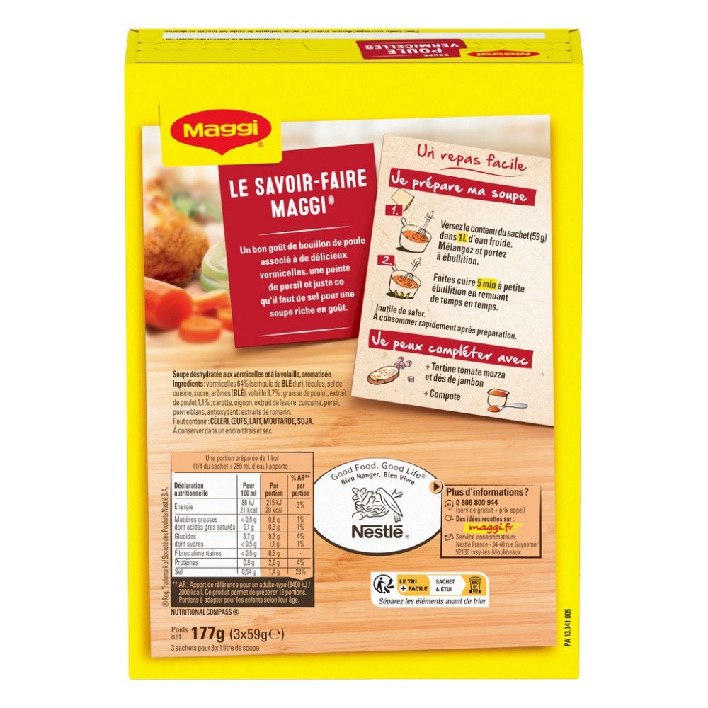Découvrez ce format familial 3 sachets de 4 assiettes de cette délicieuse soupe MAGGI au bon goût de poule alliés à de généreux vermicelles. Le savoir-faire MAGGI : un bon goût de bouillon de poule associé à de délicieux vermicelles, un bouquet garni et juste ce qu'il faut de sel pour une soupe riche en goût.