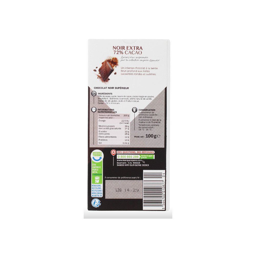 TABLETTE CHOCOLAT NOIR 72% CACAO - EQUADOR- 100G