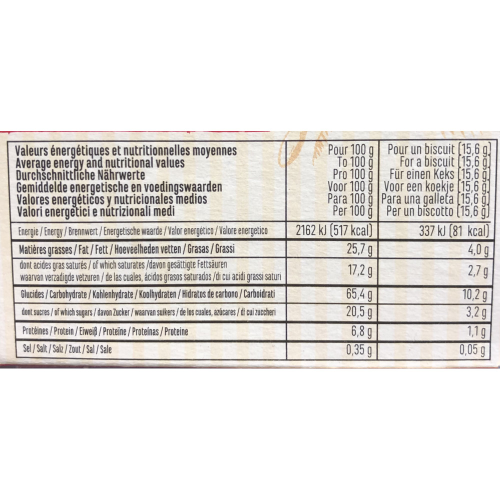 Farine de FROMENT (France), BEURRE (24%), sucre, OEUFS, jaunes d'OEUFS en poudre (1.3%), sel, arôme naturel de vanille, caramel (sirop de glucose, sucre, eau).Peut contenir des traces de soja, de sésame, et de fruits à coque