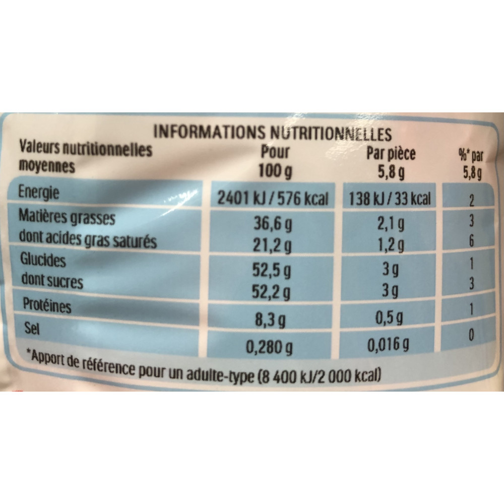 Chocolat supérieur au LAIT 50% (sucre, LAIT en poudre, beurre de cacao, pâte de cacao, émulsifiants: lécithines [SOJA], arômes), sucre, LAIT écrémé en poudre, huile de palme, NOISETTES 5,8%, BEURRE concentré, chocolat noir (sucre, pâte de cacao, beurre de cacao, émulsifiants : lécithines [SOJA], arômes), agents d'enrobage (gomme arabique, shellac), sirop de glucose, émulsifiants: lécithines [SOJA], arômes.