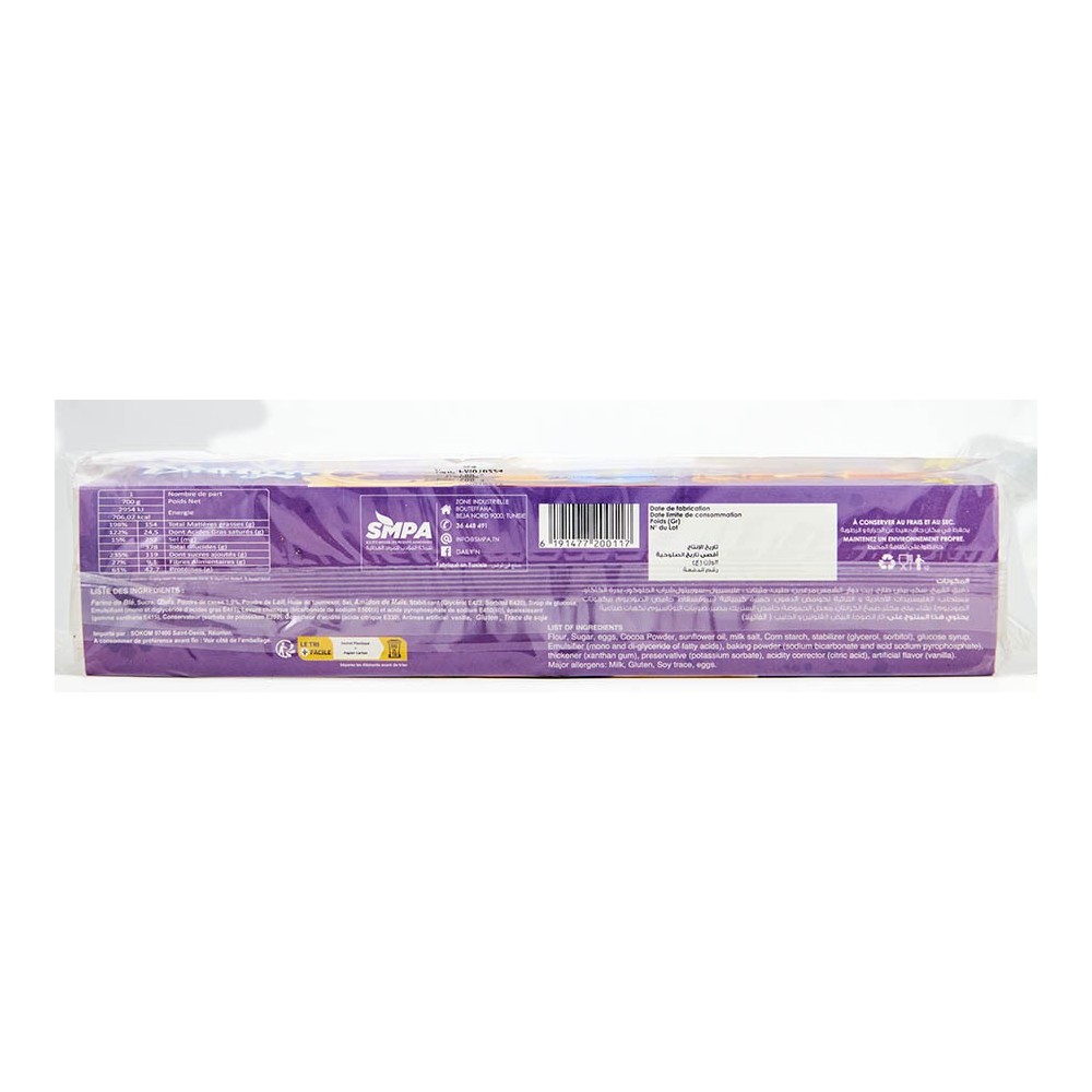 Farine de blé,sucre,oeufs,poudre de cacao 1,5%,poudre de lait,huile de tournesol,sel,amidon de mais,stabilisant(glycérole E420),sirop de glucose,émulsifiant(mono et diglycéride d'acides gras E471),levure chimique(bicabonate de sodium E500(ii) et acide pyrophosphate de sodium E450(iii),épaississant(gomme xanthane E 415),conservateur(sorbate de potassium E202),correcteur d'acidité(acide citrique E330),aromes artificiel vanille,gluten