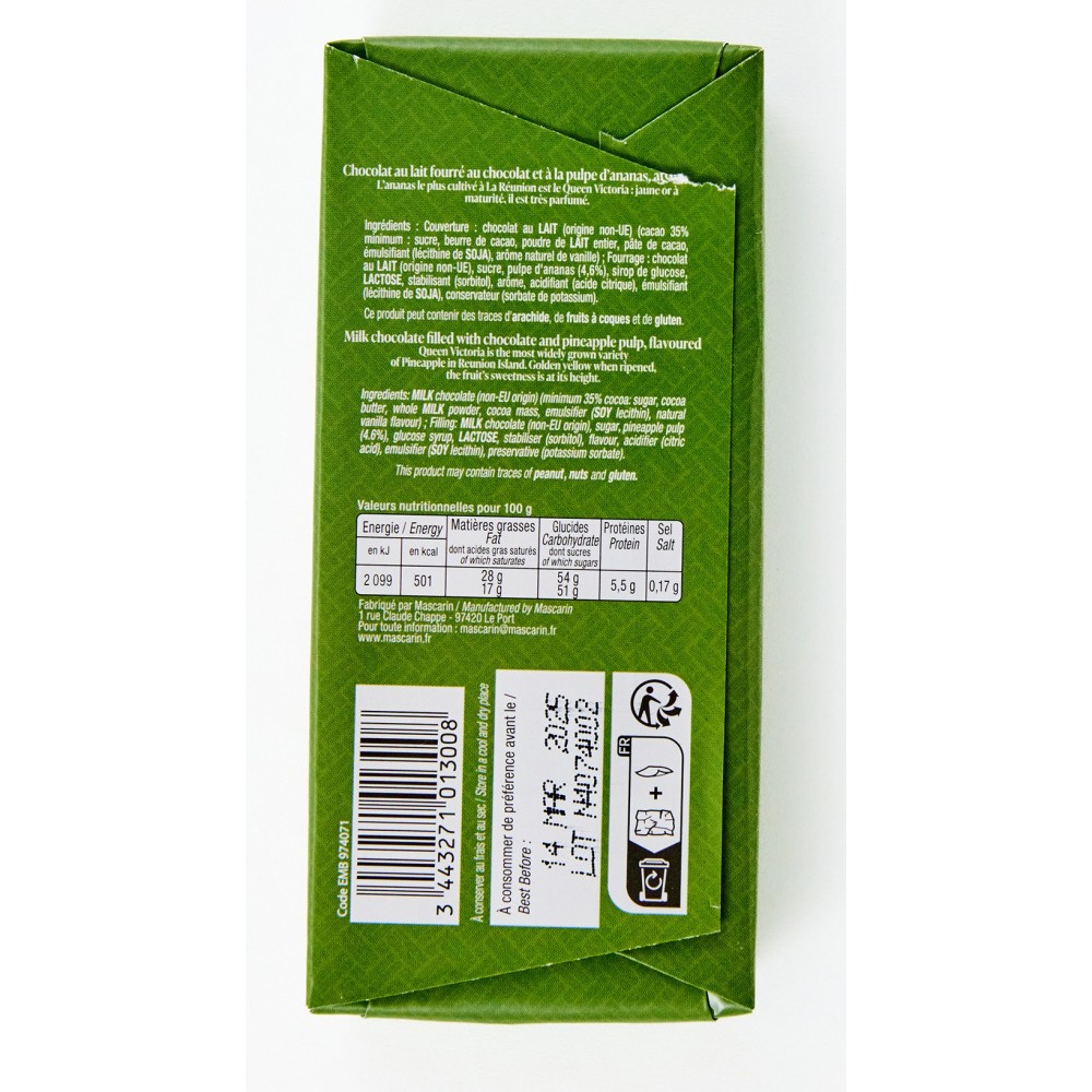 Tablette Chocolat au lait fourré ananas - MASCARIN - 100g