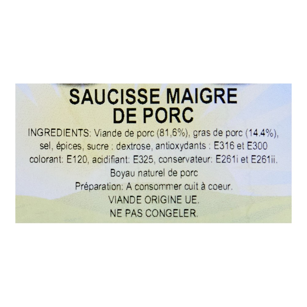 viande de porc(81,6%),gras de porc(14,4%),sel,épices,sucre,dextrose,antioxydants:E316 et E300 ,colorant:E120,acidifiant:E325,conservateur:E261i et E261ii,boyau naturel de porc