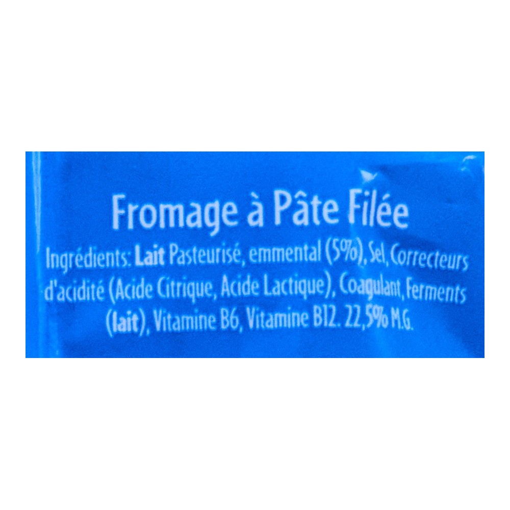 lait pasteurisé, emmental 5%, sel, correcteurs d'acidité (acide citrique, acide lactique), coagulant, ferments (lait), vitamine B6, vitamine B12 22,5%