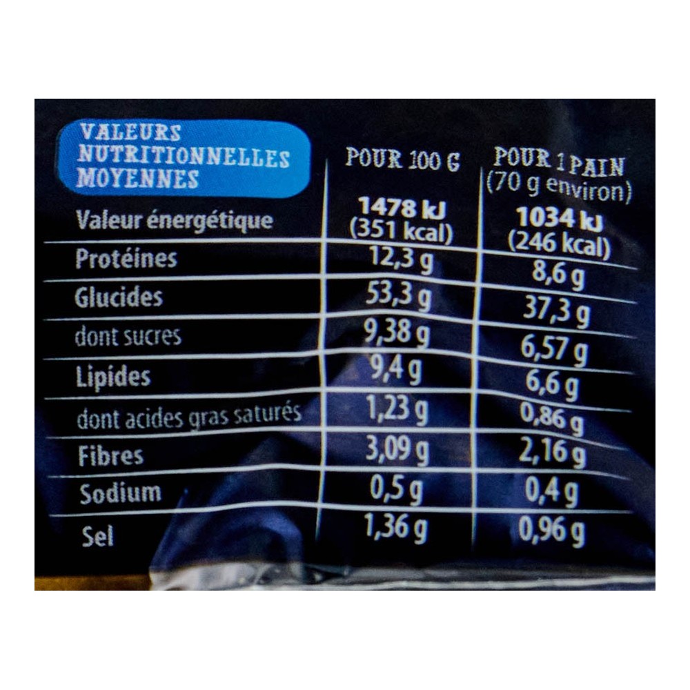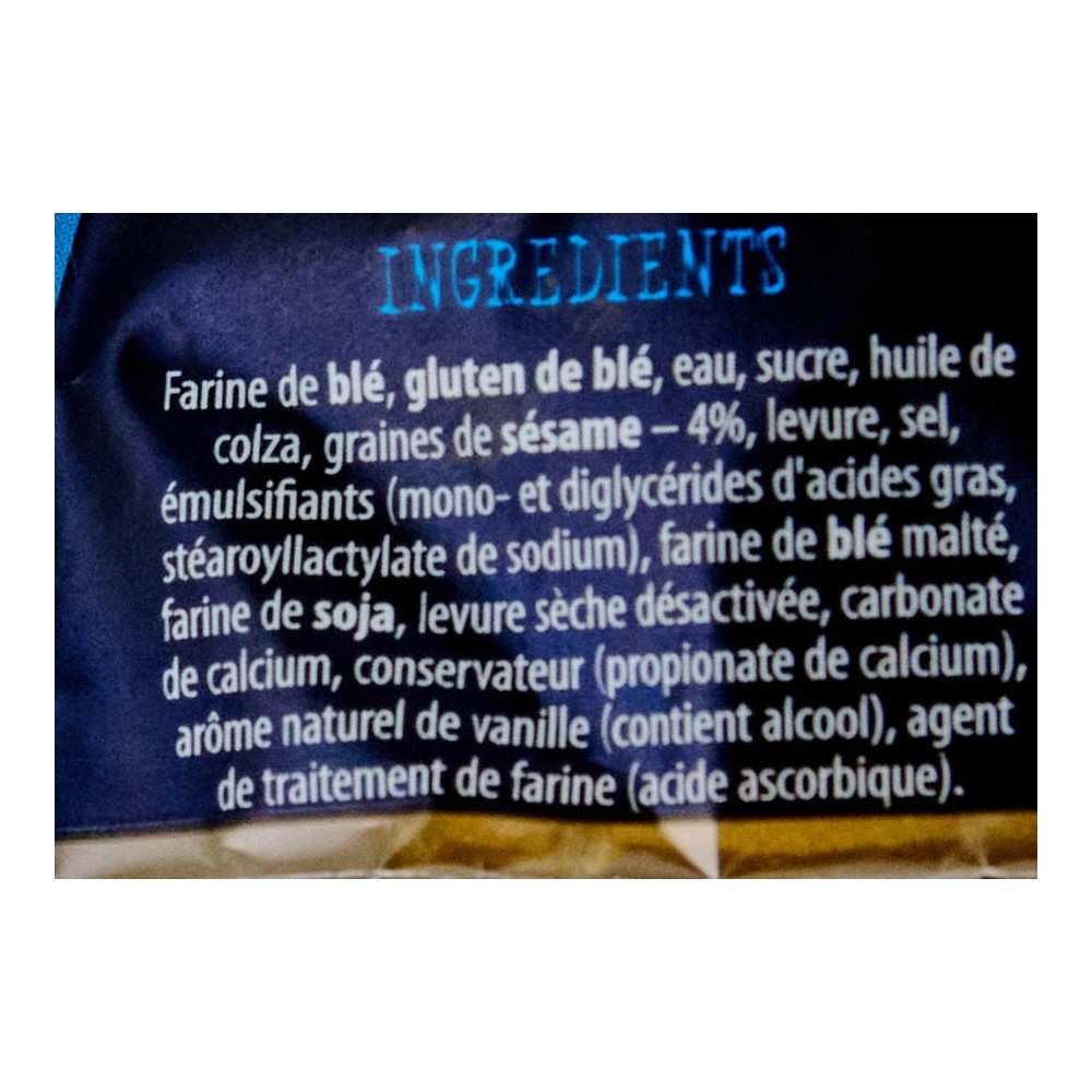 Farine de blé, gluten de blé, eau, sucre, huile de colza, graines de sésame-4%, levure, sel, émulsifiants (mono- et diglycérides d'acies gras, stéarocyllactylate de sodium), farine de blé malté, farine de soja, levure de sèche désactivée, carbonate de calcium, conservateur (propionate de caclium), arôme naturel de vanille (contient alcool), agent de traitement de farine (acide ascorbique)
