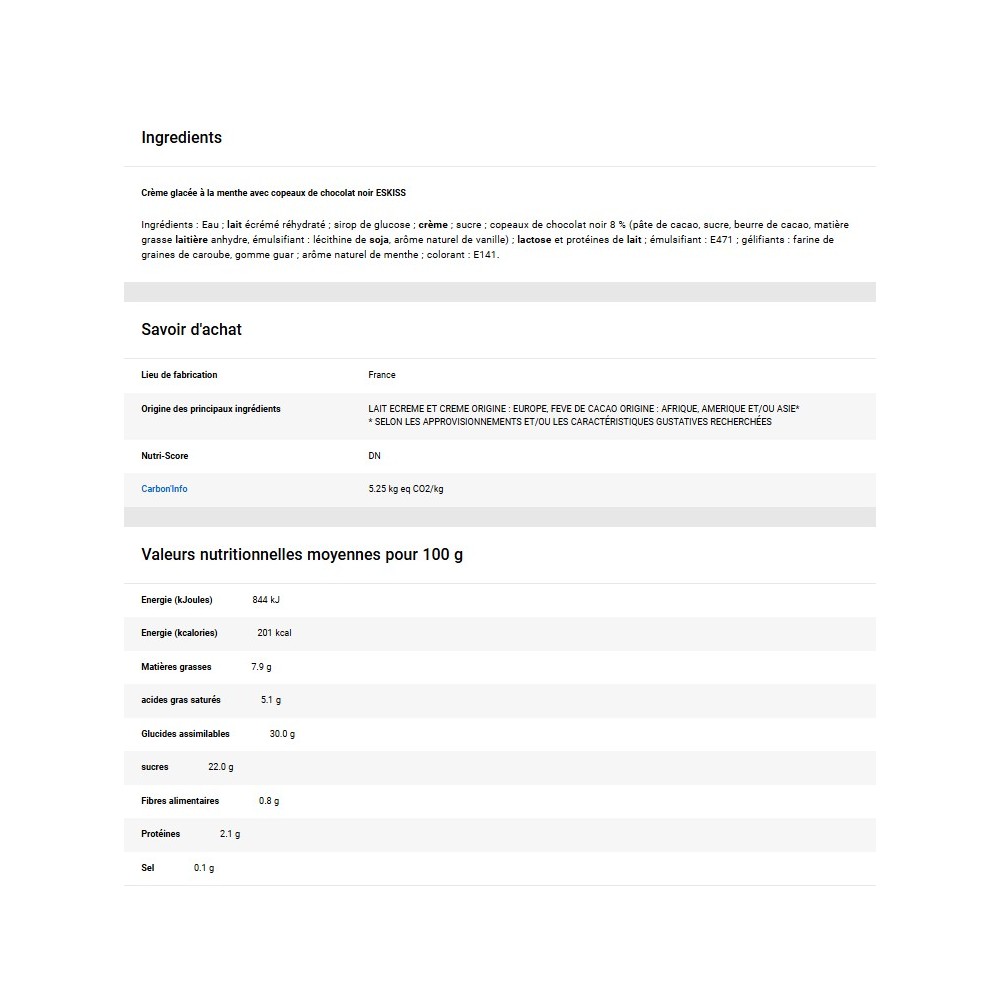 Ingrédients : Eau ; lait écrémé réhydraté ; sirop de glucose ; crème ; sucre ; copeaux de chocolat noir 8 % (pâte de cacao, sucre, beurre de cacao, matière grasse laitière anhydre, émulsifiant : lécithine de soja, arôme naturel de vanille) ; lactose et protéines de lait ; émulsifiant : E471 ; gélifiants : farine de graines de caroube, gomme guar ; arôme naturel de menthe ; colorant : E141.