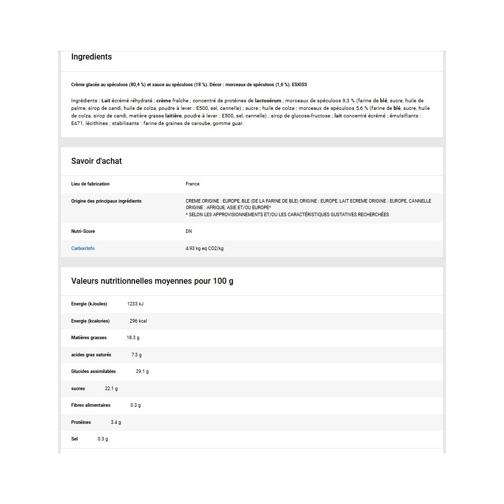 Ingrédients : Lait écrémé réhydraté ; crème fraîche ; concentré de protéines de lactosérum ; morceaux de spéculoos 9,3 % (farine de blé, sucre, huile de palme, sirop de candi, huile de colza, poudre à lever : E500, sel, cannelle) ; sucre ; huile de colza ; morceaux de spéculoos 5,6 % (farine de blé, sucre, huile de colza, sirop de candi, matière grasse laitière, poudre à lever : E500, sel, cannelle) ; sirop de glucose-fructose ; lait concentré écrémé ; émulsifiants : E471, lécithines ; stabilisants : farine de graines de caroube, gomme guar.