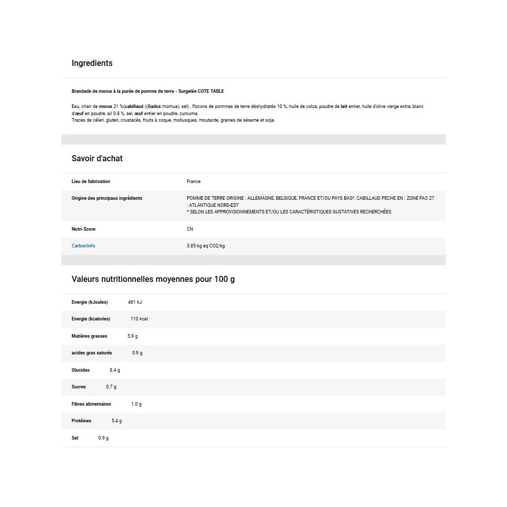 Eau, chair de morue 21 %(cabillaud ((Gadus morhua), sel) , flocons de pommes de terre déshydratés 10 %, huile de colza, poudre de lait entier, huile d'olive vierge extra, blanc d'œuf en poudre, ail 0.8 %, sel, œuf entier en poudre, curcuma.