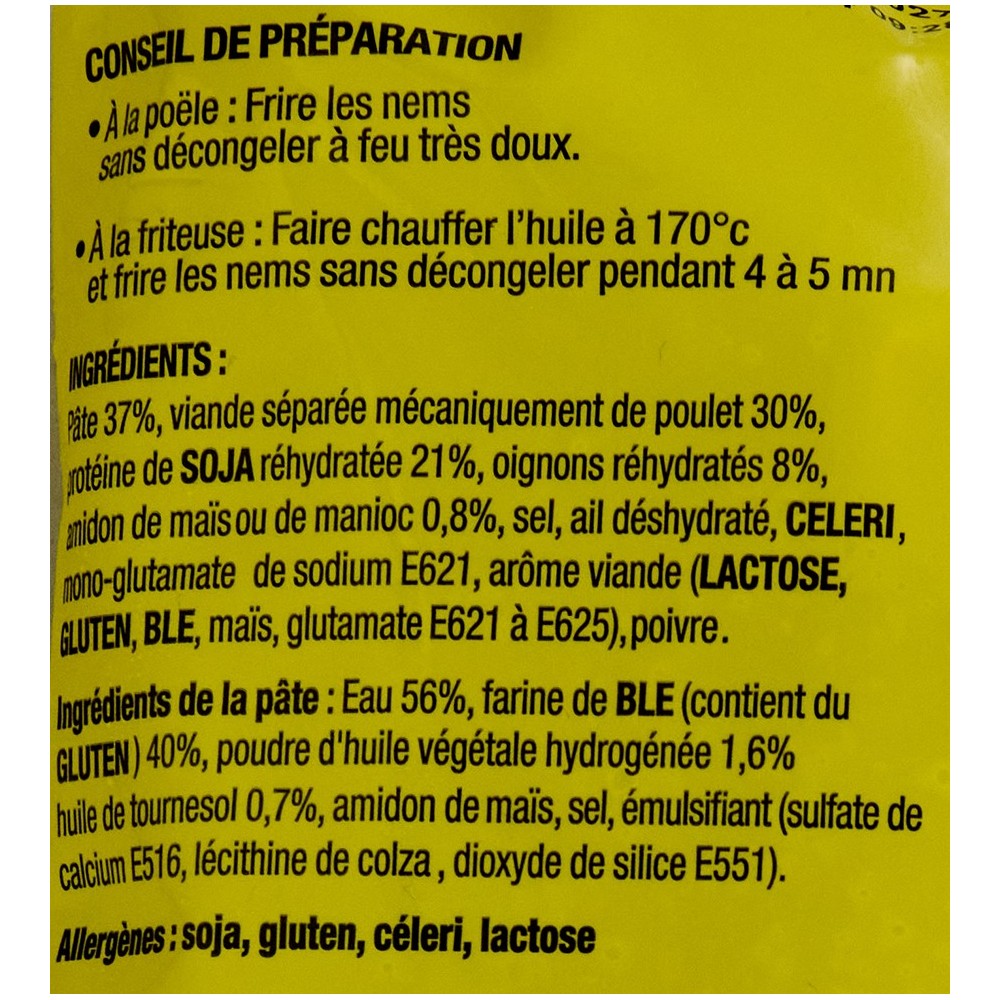 pate 37%, viande séparée mécaniquement de poulet 30%, protéine de soja réhydraté 21%, oignons réhydraté 8%, amidon de maïs ou de manioc 0,8%, sel, ail déshydraté, céleri, mono-glutamate de sodium E621, arôme viande (lactose, gluten, blé, maïs, glutamate E621 à E625), poivre. Pâte : Eau 56%, farine de blé (contient du gluten) 40% poudre d'huile végétale hydrogénée 1,6%, huile de tournesol 0,7%, amidon de maïs, sel, émulsifiant (sulfate de calcium E516, lécithine de colza, dioxyde de silice E551)