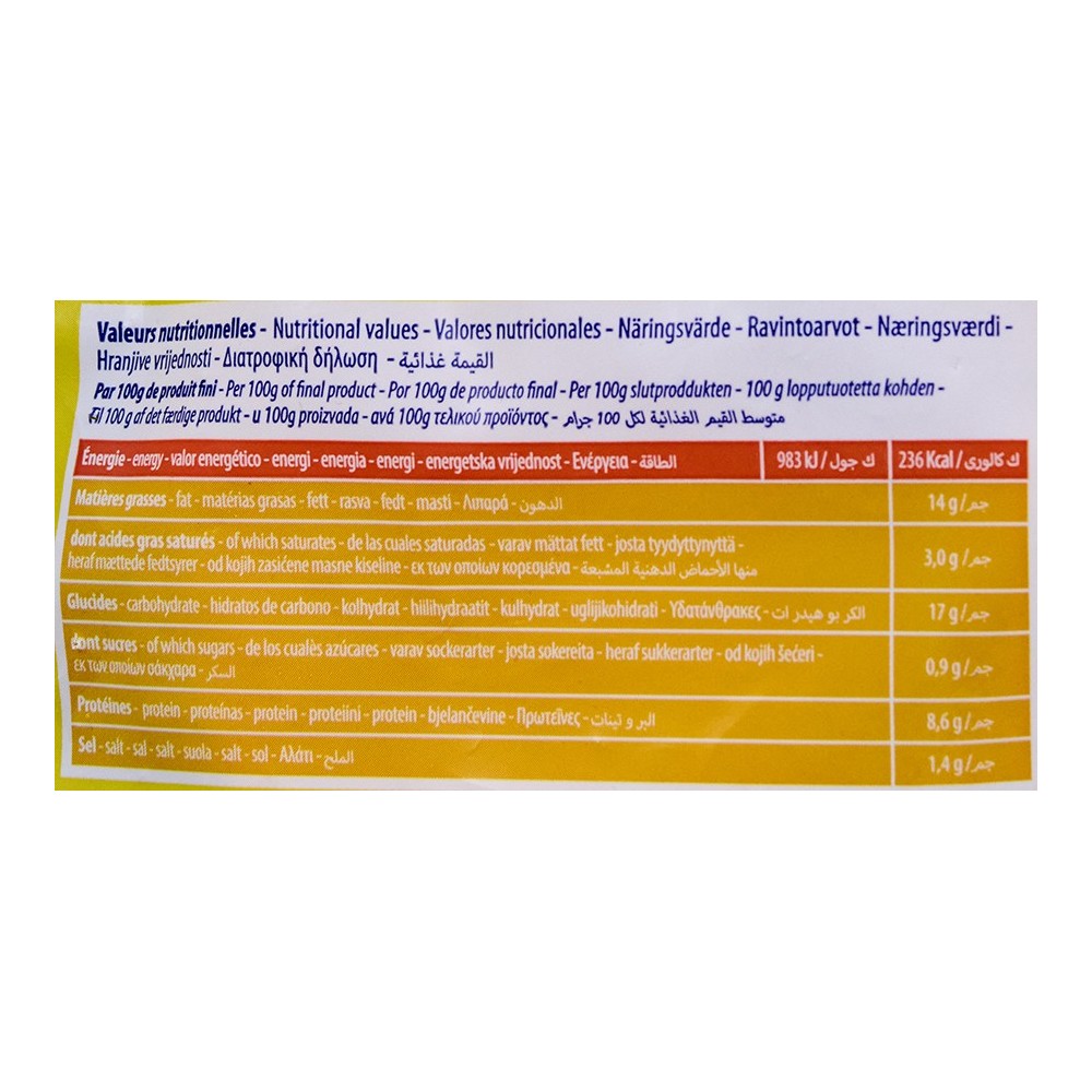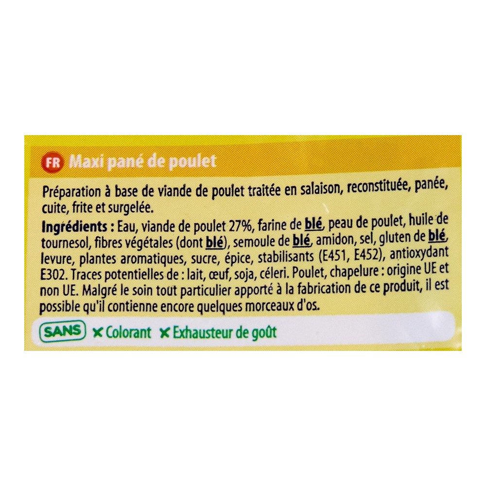 eau, viande de poulet, farine de blé, peau de poulet, fibres vegetales, semoule de blé, amidon, sel, levure, plante aromatique, sucre, epices, stabilisant, antioxidant. Trace potentielle de : lait, oeuf, soja, celeri. Poulet , chapelur : origine UE et non ue. Malgré le soin tout particulier apporté a la fabrication de ce produit, il est possible qu il contienne encore quelques moreaux d os