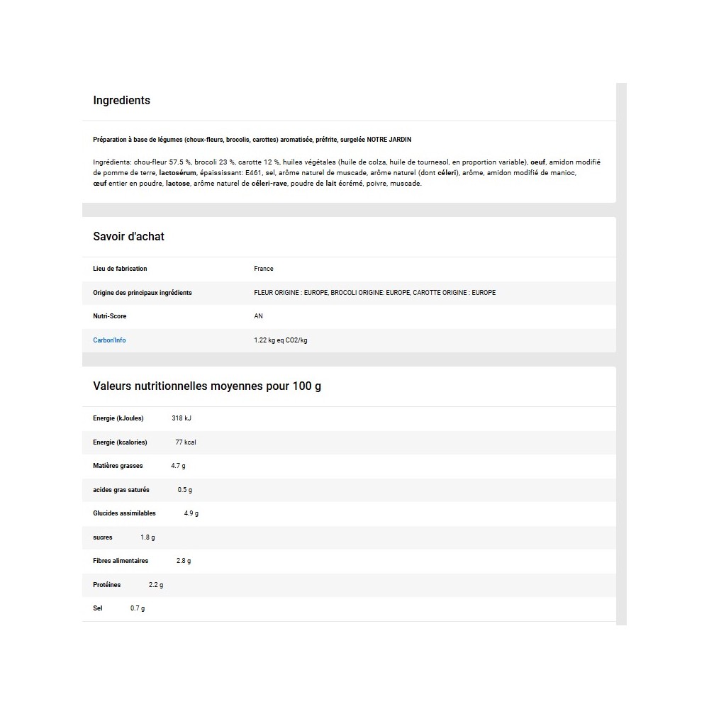 Ingrédients: chou-fleur 57.5 %, brocoli 23 %, carotte 12 %, huiles végétales (huile de colza, huile de tournesol, en proportion variable), oeuf, amidon modifié de pomme de terre, lactosérum, épaississant: E461, sel, arôme naturel de muscade, arôme naturel (dont céleri), arôme, amidon modifié de manioc, œuf entier en poudre, lactose, arôme naturel de céleri-rave, poudre de lait écrémé, poivre, muscade.