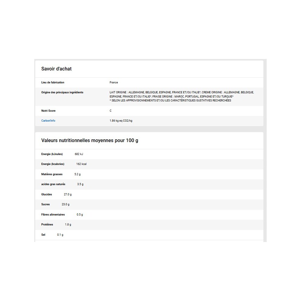 Eau ; LAIT écrémé réhydraté ; purée de fraise 13 % ; sucre ; CREME ; sirops de glucose ; morceaux de fraise 6,6 % ; LACTOSE et protéines de LAIT ; émulsifiant : E471 ; gélifiants : farine de graines de caroube, gomme guar, pectines, gomme xanthane ; arôme naturel de fraise ; concentré de betterave rouge ; pulpe de fraise 0,1 % ; acidifiant : acide citrique ; jus concentré de citron.