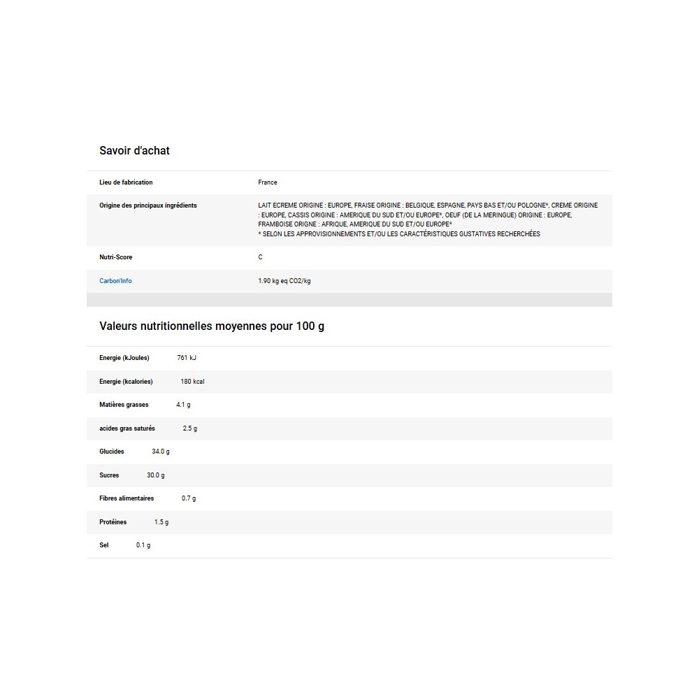 Eau ; sucre ; sirop de glucose-fructose ; lait écrémé réhydraté ; purée de fraises 9,4 % ; crème fraîche ; purée de framboise 6,9 % ; jus de cassis à base de concentré 3,6 % ; concentré de protéines de lactosérum en poudre ; purée de cassis à base de concentré 1,6 % ; morceaux de meringue 1,6 % (sucre, blanc d’œufs 0,4 %, graisse végétale de coprah) ; colorants : rouge de betterave, anthocyanes, caroténoïdes ; amidon modifié de maïs ; jus de citron concentré ; arôme naturel de cassis ; stabilisants : gomme guar, farine de graines de caroube ; émulsifiant : E471 ; épaississant : pectines ; correcteurs d'acidité : acide citrique, E331 ; lactose et protéines de lait ; arôme naturel ; concentré de sureau ; jus de carotte noire concentré ; dextrose ; protéines de pois hydrolysées ; arôme naturel de vanille. Traces de fruits à coque.