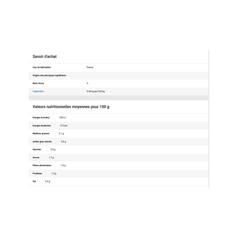 Courgettes en rondelles vertes et jaunes 75 %, demi-tomates cerise 20 %, huile d’olive vierge 3,6 %, basilic 0,9 %, sel, ail 0,1 %. Traces de gluten, crustacés, œufs, poissons, soja, lait, fruits à coque, céleri, moutarde et de graines de sésame.
