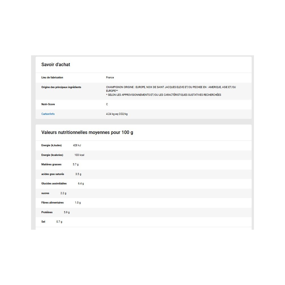 Ingrédients : Noix de Saint-Jacques* 35 %, eau, oignon, champignon de Paris 8,1 %, vin blanc (dont sulfites) 5,5 %, crème fraîche 5,5 %, chapelure (farine de blé, levure, sel), lait écrémé en poudre, amidon de maïs, beurre, ail, Vermouth (dont sulfites), contient huile de tournesol et/ou huile de colza, sel, Brandy, fumet de poisson déshydraté (sel, poisson en poudre, extrait de vin blanc, fructose, plantes aromatiques [oignon, ail], jus de citron déshydraté, extrait de citron, huile d'olive, extraits de plantes aromatiques [thym, laurier]) (dont sulfites), persil, arôme naturel de poivre.