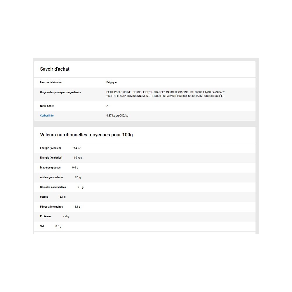 Ingrédients: Petits pois doux extra-fins (55 % mini), jeunes carottes extra-fines (25 % mini)
