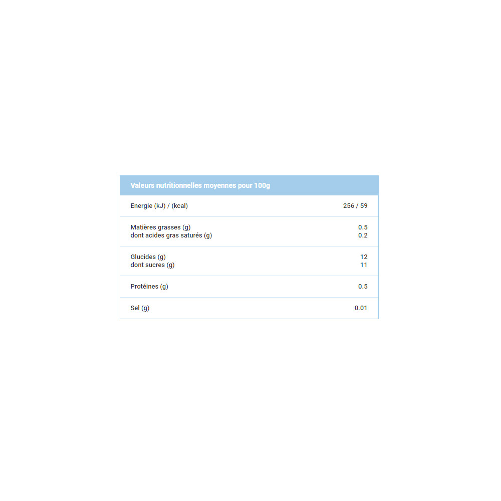 Pomme : pomme* 99,9 %, jus de citron concentré* (si nécessaire pour réguler l'acidité), antioxydant : acide ascorbique *issu de l'agriculture biologique Pomme Mirabelle : pomme* 79,8 %, mirabelle* 20,0 %, arôme naturel, jus de citron concentré* (si nécessaire pour réguler l'acidité), antioxydant : acide ascorbique *issu de l'agriculture biologique Pomme Framboise : pomme* 84,7 %, framboise* 15,0 %, arôme naturel, antioxydant : acide ascorbique *issu de l'agriculture biologique Pomme Banane : pomme* 81,9 %, banane* 18,0 %, jus de citron concentré* (si nécessaire pour réguler l'acidité), antioxydant : acide ascorbique *issu de l'agriculture biologique
