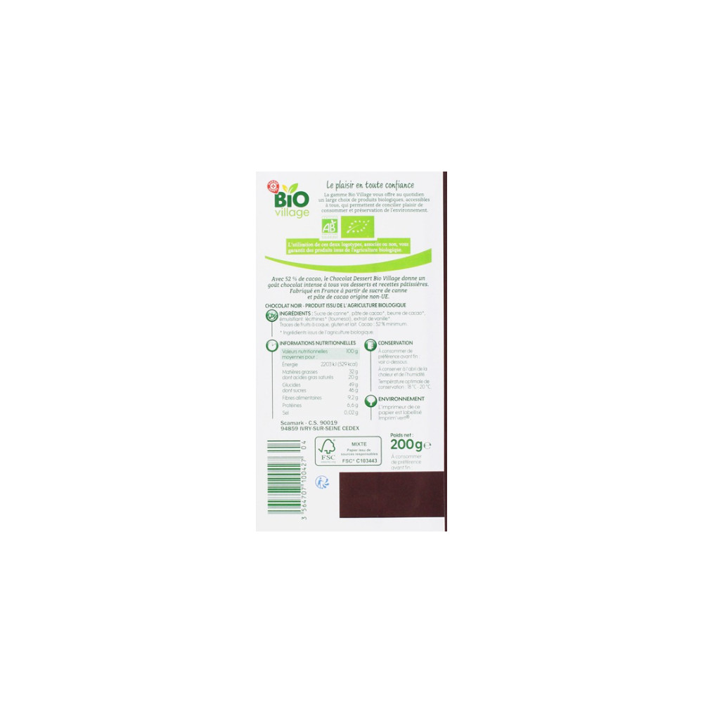 Avec 52% de cacao, le Chocolat Dessert Bio Village donne un gout chocolat intense a tous vos desserts et recettes patissieres. Fabrique en France a partir de sucre de canne et pate de cacao origine non-UE.