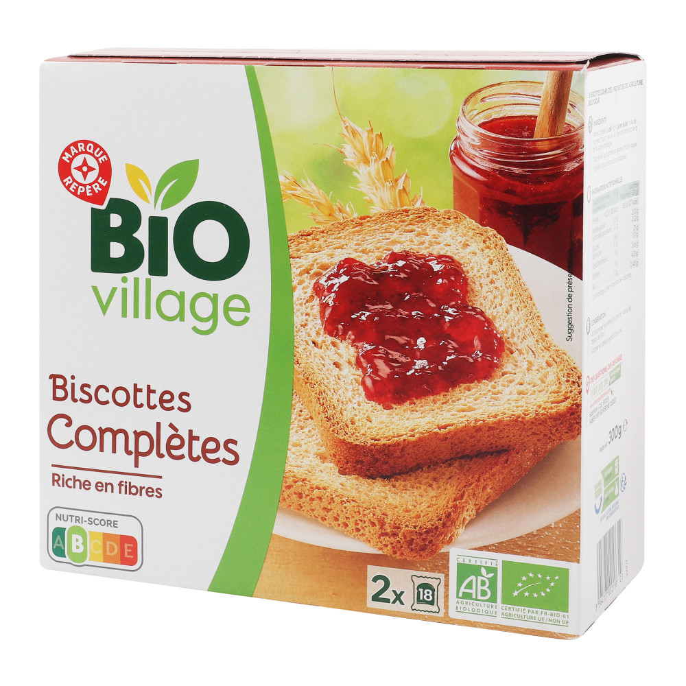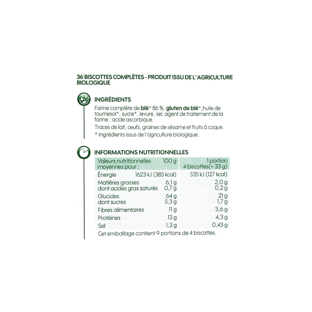 Croustillantes et finement dorees, ces savoureuse biscottes au ble complet accompagneront tous vos petits dejeuners. Degustez-les nature, beurees ou encore nappees de confiture. Elaborees avec de la farine complete de ble, elles sont riches en fibre et contribuent ainsi a vos apports journaliers dans le cadre d'une alimentation equilibree.