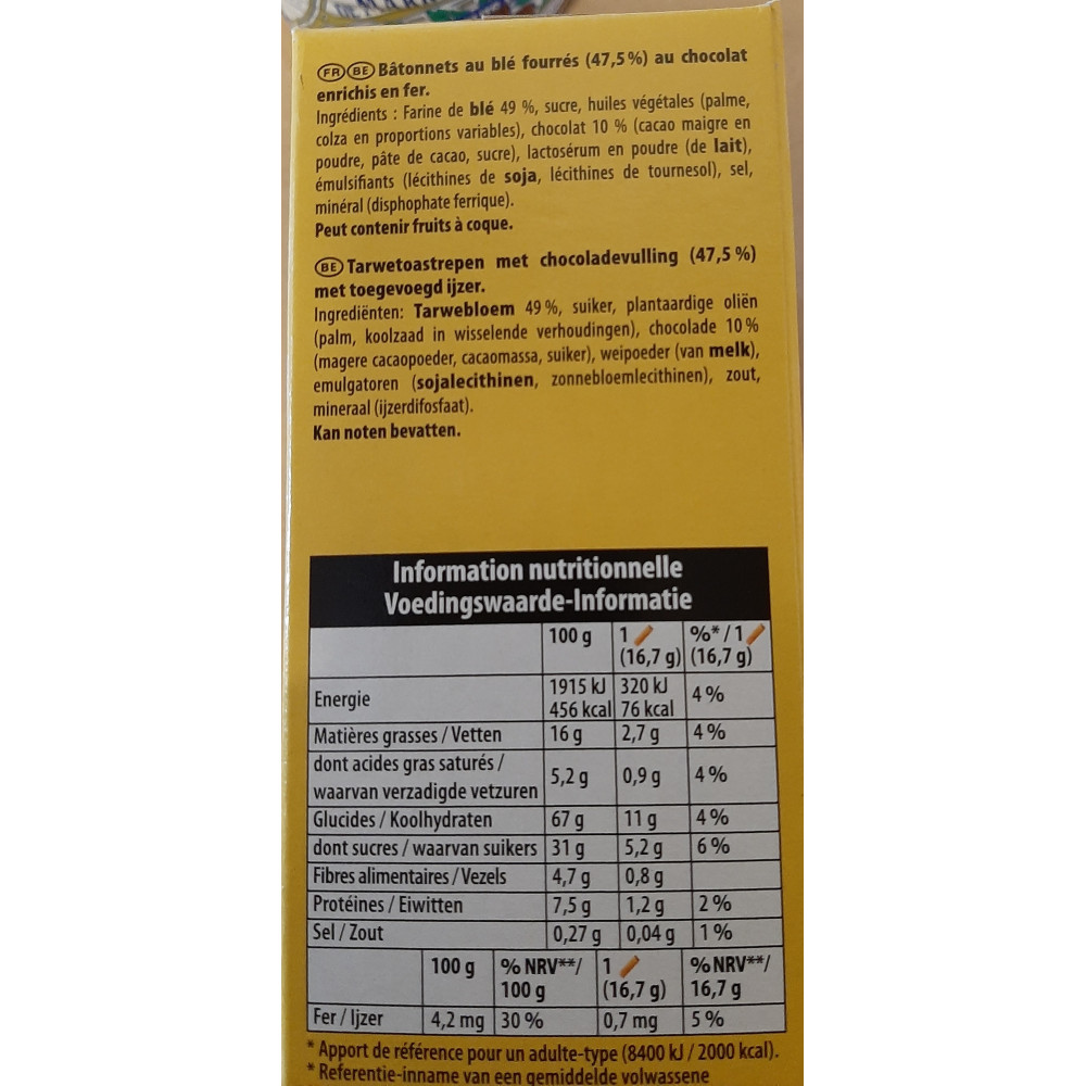 Ingrédients : Ingrédients : Farine de BLÉ 47%, sucre, huiles végétales (palme, colza en proportions variables), chocolat 10% (cacao maigre en poudre, pâte de cacao, sucre), lactosérum en poudre (de LAIT), émulsifiants (lécithine de SOJA, lécithine de tournesol), sel, minéral (disphophate ferrique). PEUT CONTENIR FRUITS À COQUE.