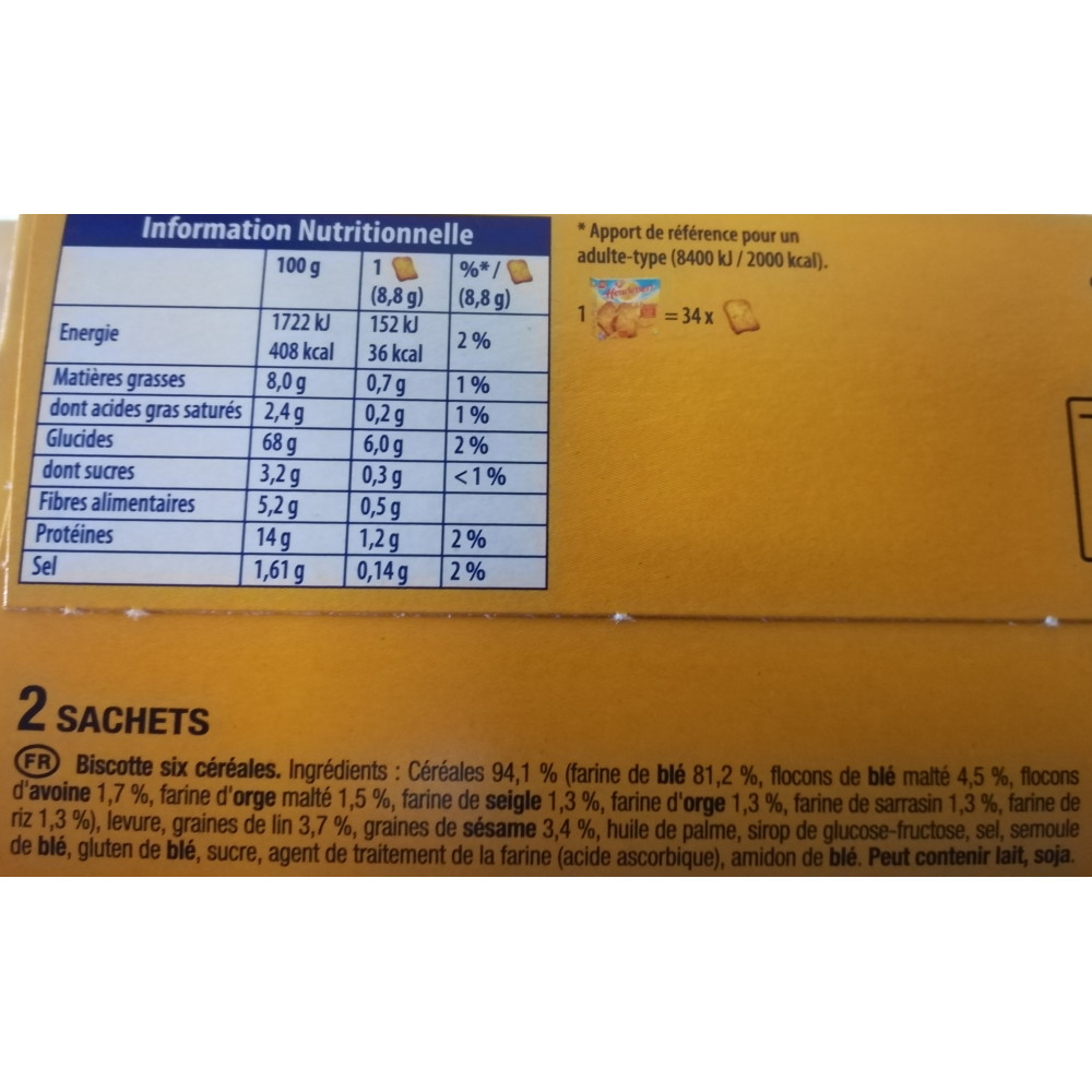 Ingrédients : Ingrédients : Céréales 94,1 % (farine de BLÉ 81,2 %, flocons de BLÉ malté 4,5 %, flocons d'AVOINe 1,7 %, farine d'ORGE malté 1,5 %, farine de SEIGLE 1,3 %, farine d'ORGE 1,3 %, farine de sarrasin 1,3 %, farine de riz 1,3 %), levure, graines de lin 3,7 %, graines de SÉSAME 3,4 %, huile de palme, sirop de glucose-fructose, sel, semoule de BLÉ, gluten de BLÉ, sucre, agent de traitement de la farine (acide ascorbique), amidon de BLÉ. PEUT CONTENIR LAIT, SOJA.