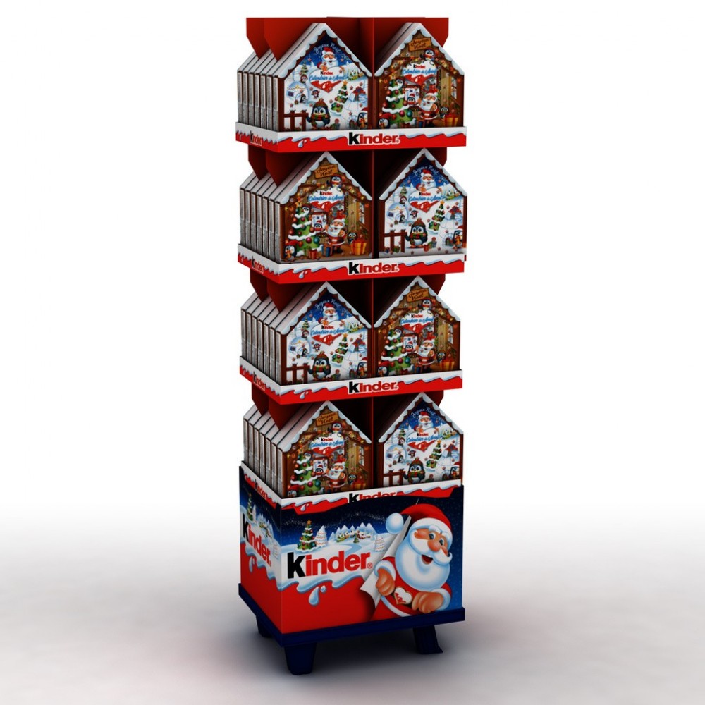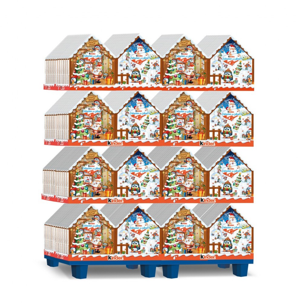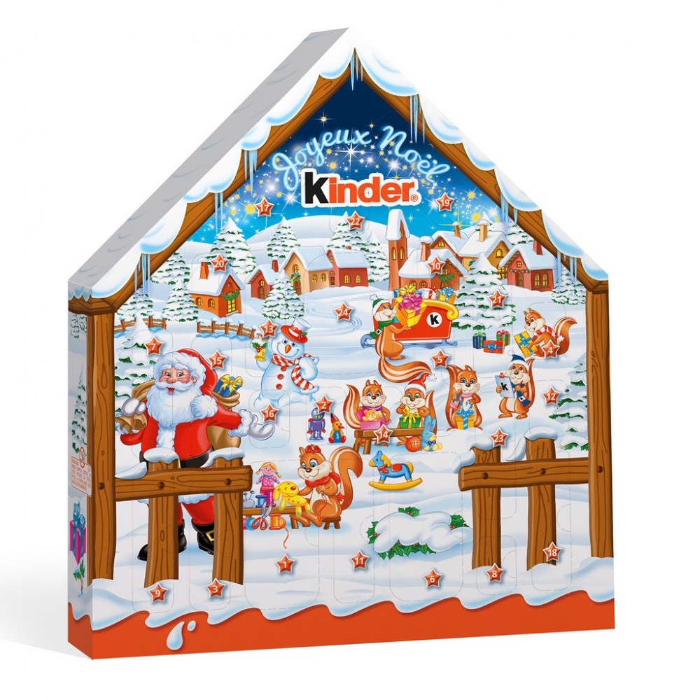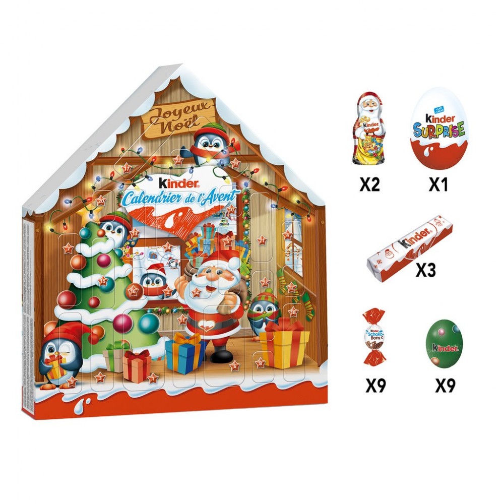 K FIGURE CAVE: Confiserie recouverte de chocolat supérieur au lait. KINDER CHOCOLATE: Chocolat supérieur au lait avec fourrage au lait. KINDER CIRCUS: Petits œufs de chocolat supérieur au lait avec fourrage lait et noisettes. SCHOKOBONS: Bonbons de chocolat supérieur au lait avec fourrage au lait (42,5%) et éclats de noisettes. KINDER SURPRISE: Confiserie recouverte de chocolat supérieur au lait contenant une surprise dans une capsule plastique.