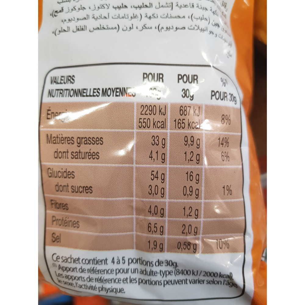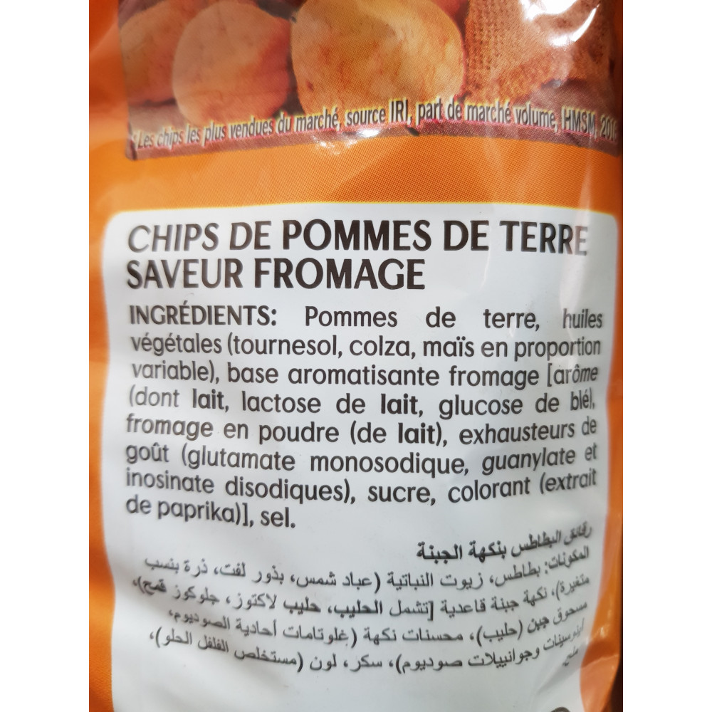 Pommes de terre, huiles végétables (tournesol, colza, maïs en proportion variable), base aromatisante fromage (arôme dont lait, lactose de lait, glucose de blé), fromage en poudre de lait, exhausteurs de goût glucotamate monosodique, guanylitate et inosinate disodiques, sucre, colorant (extrait de paprika), sel.